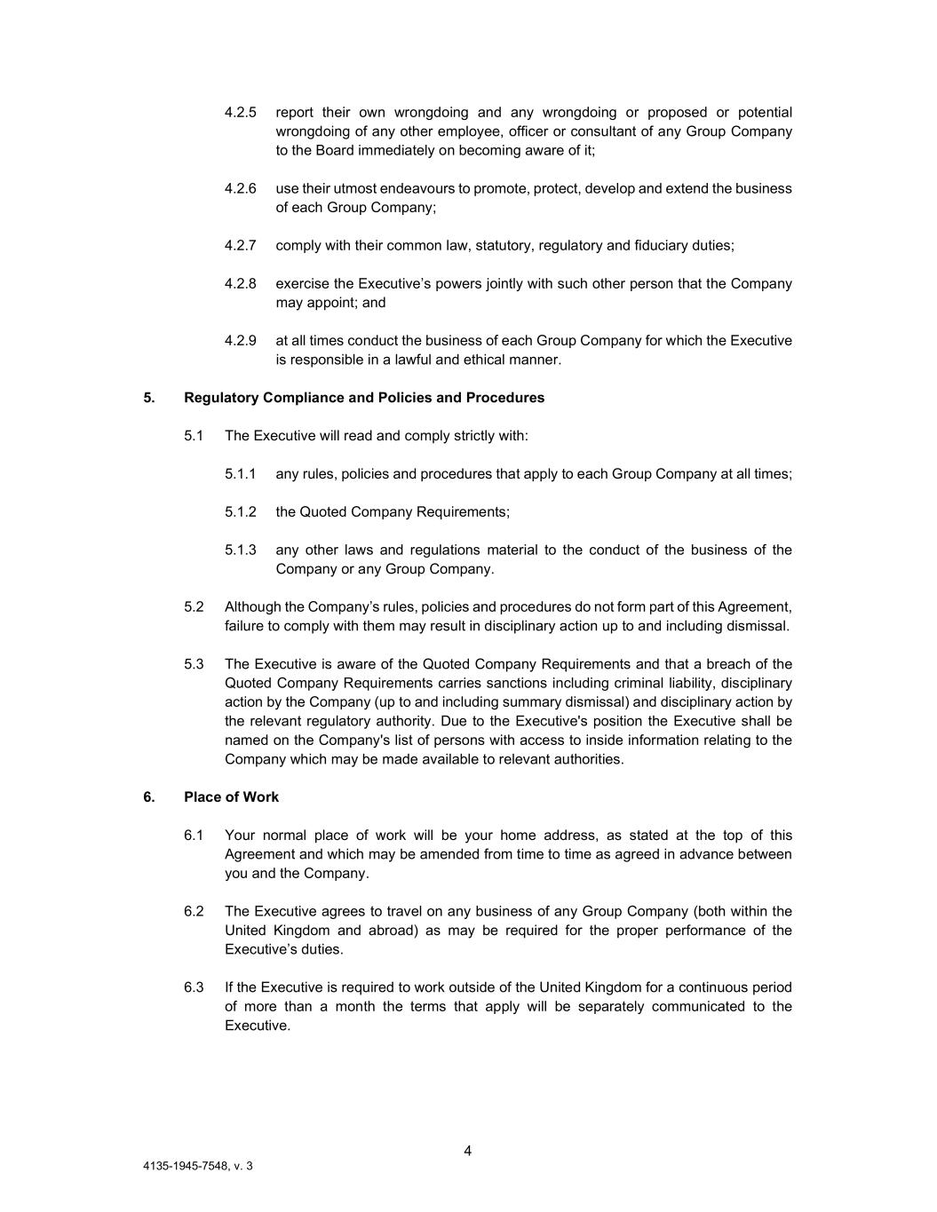 4  4135-1945-7548, v. 3  4.2.5 report their own wrongdoing and any wrongdoing or proposed or potential  wrongdoing of any other employee, officer or consultant of any Group Company  to the Board immediately on becoming aware of it;    4.2.6 use their utmost endeavours to promote, protect, develop and extend the business  of each Group Company;     4.2.7 comply with their common law, statutory, regulatory and fiduciary duties;     4.2.8 exercise the Executive’s powers jointly with such other person that the Company  may appoint; and    4.2.9 at all times conduct the business of each Group Company for which the Executive  is responsible in a lawful and ethical manner.    5. Regulatory Compliance and Policies and Procedures    5.1 The Executive will read and comply strictly with:    5.1.1 any rules, policies and procedures that apply to each Group Company at all times;     5.1.2 the Quoted Company Requirements;    5.1.3 any other laws and regulations material to the conduct of the business of the  Company or any Group Company.      5.2 Although the Company’s rules, policies and procedures do not form part of this Agreement,  failure to comply with them may result in disciplinary action up to and including dismissal.     5.3 The Executive is aware of the Quoted Company Requirements and that a breach of the  Quoted Company Requirements carries sanctions including criminal liability, disciplinary  action by the Company (up to and including summary dismissal) and disciplinary action by  the relevant regulatory authority. Due to the Executive's position the Executive shall be  named on the Company's list of persons with access to inside information relating to the  Company which may be made available to relevant authorities.    6. Place of Work    6.1 Your normal place of work will be your home address, as stated at the top of this  Agreement and which may be amended from time to time as agreed in advance between  you and the Company.    6.2 The Executive agrees to travel on any business of any Group Company (both within the  United Kingdom and abroad) as may be required for the proper performance of the  Executive’s duties.    6.3 If the Executive is required to work outside of the United Kingdom for a continuous period  of more than a month the terms that apply will be separately communicated to the  Executive.