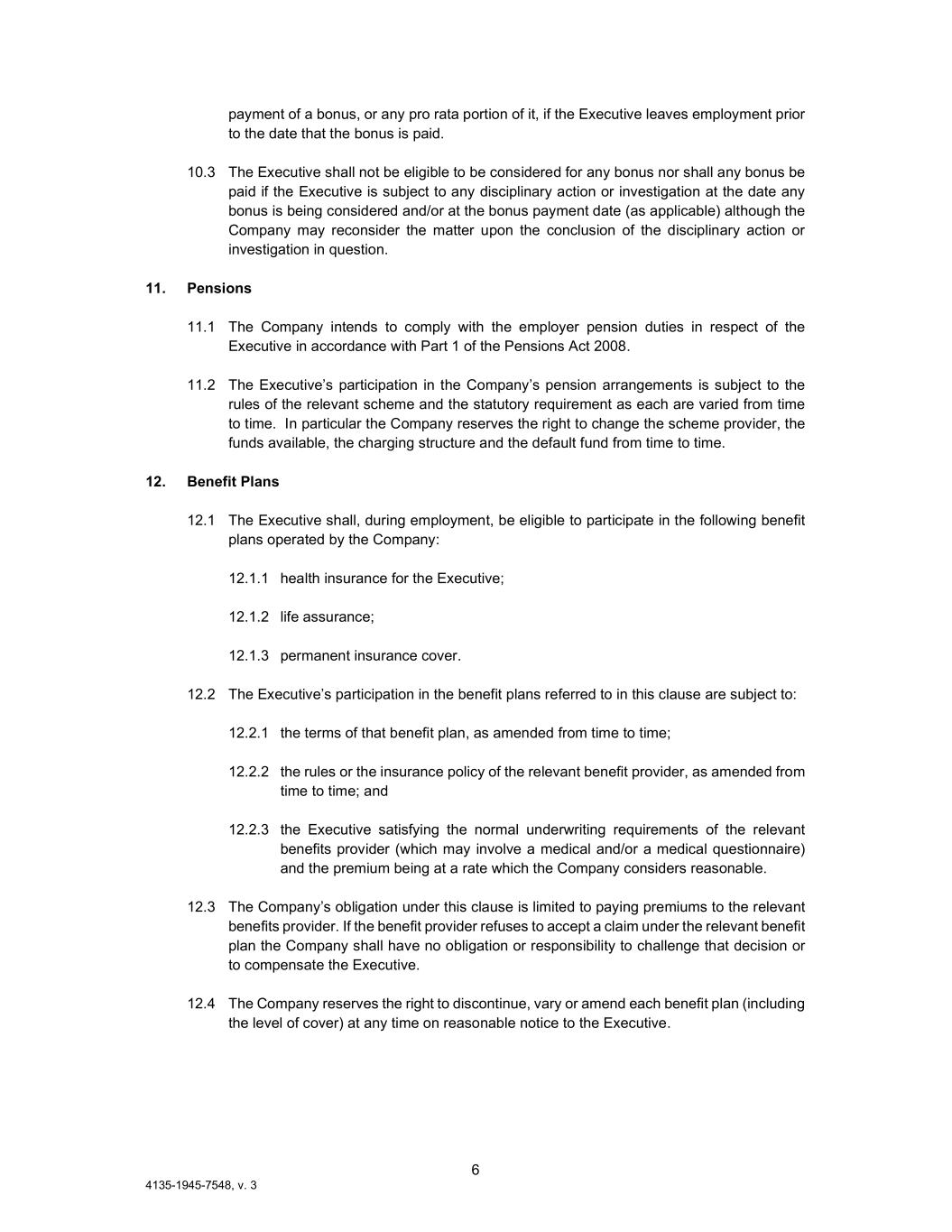 6  4135-1945-7548, v. 3  payment of a bonus, or any pro rata portion of it, if the Executive leaves employment prior  to the date that the bonus is paid.    10.3 The Executive shall not be eligible to be considered for any bonus nor shall any bonus be  paid if the Executive is subject to any disciplinary action or investigation at the date any  bonus is being considered and/or at the bonus payment date (as applicable) although the  Company may reconsider the matter upon the conclusion of the disciplinary action or  investigation in question.      11. Pensions    11.1 The Company intends to comply with the employer pension duties in respect of the  Executive in accordance with Part 1 of the Pensions Act 2008.    11.2 The Executive’s participation in the Company’s pension arrangements is subject to the  rules of the relevant scheme and the statutory requirement as each are varied from time  to time.  In particular the Company reserves the right to change the scheme provider, the  funds available, the charging structure and the default fund from time to time.      12. Benefit Plans    12.1 The Executive shall, during employment, be eligible to participate in the following benefit  plans operated by the Company:    12.1.1 health insurance for the Executive;    12.1.2 life assurance;    12.1.3 permanent insurance cover.    12.2 The Executive’s participation in the benefit plans referred to in this clause are subject to:    12.2.1 the terms of that benefit plan, as amended from time to time;    12.2.2 the rules or the insurance policy of the relevant benefit provider, as amended from  time to time; and    12.2.3 the Executive satisfying the normal underwriting requirements of the relevant  benefits provider (which may involve a medical and/or a medical questionnaire)  and the premium being at a rate which the Company considers reasonable.    12.3 The Company’s obligation under this clause is limited to paying premiums to the relevant  benefits provider. If the benefit provider refuses to accept a claim under the relevant benefit  plan the Company shall have no obligation or responsibility to challenge that decision or  to compensate the Executive.       12.4 The Company reserves the right to discontinue, vary or amend each benefit plan (including  the level of cover) at any time on reasonable notice to the Executive.
