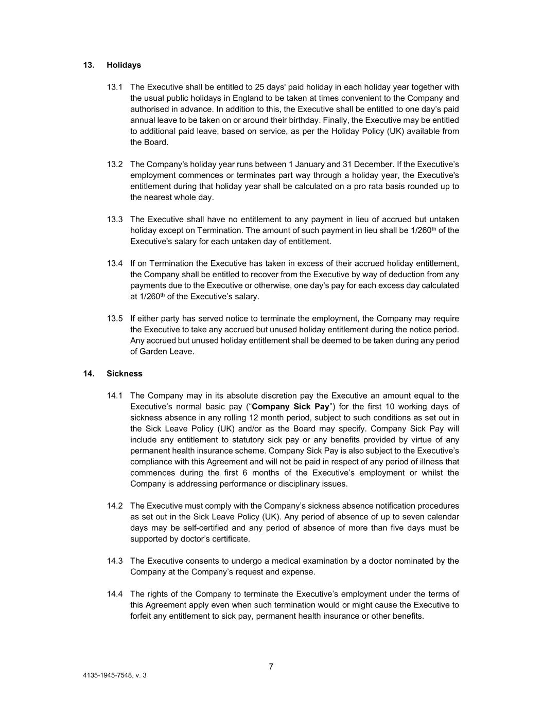 7  4135-1945-7548, v. 3  13. Holidays     13.1 The Executive shall be entitled to 25 days' paid holiday in each holiday year together with  the usual public holidays in England to be taken at times convenient to the Company and  authorised in advance. In addition to this, the Executive shall be entitled to one day’s paid  annual leave to be taken on or around their birthday. Finally, the Executive may be entitled  to additional paid leave, based on service, as per the Holiday Policy (UK) available from  the Board.    13.2 The Company's holiday year runs between 1 January and 31 December. If the Executive’s  employment commences or terminates part way through a holiday year, the Executive's  entitlement during that holiday year shall be calculated on a pro rata basis rounded up to  the nearest whole day.    13.3 The Executive shall have no entitlement to any payment in lieu of accrued but untaken  holiday except on Termination. The amount of such payment in lieu shall be 1/260th of the  Executive's salary for each untaken day of entitlement.    13.4 If on Termination the Executive has taken in excess of their accrued holiday entitlement,  the Company shall be entitled to recover from the Executive by way of deduction from any  payments due to the Executive or otherwise, one day's pay for each excess day calculated  at 1/260th of the Executive’s salary.    13.5 If either party has served notice to terminate the employment, the Company may require  the Executive to take any accrued but unused holiday entitlement during the notice period.  Any accrued but unused holiday entitlement shall be deemed to be taken during any period  of Garden Leave.    14. Sickness    14.1 The Company may in its absolute discretion pay the Executive an amount equal to the  Executive’s normal basic pay (“Company Sick Pay”) for the first 10 working days of  sickness absence in any rolling 12 month period, subject to such conditions as set out in  the Sick Leave Policy (UK) and/or as the Board may specify. Company Sick Pay will  include any entitlement to statutory sick pay or any benefits provided by virtue of any  permanent health insurance scheme. Company Sick Pay is also subject to the Executive’s  compliance with this Agreement and will not be paid in respect of any period of illness that  commences during the first 6 months of the Executive’s employment or whilst the  Company is addressing performance or disciplinary issues.    14.2 The Executive must comply with the Company’s sickness absence notification procedures  as set out in the Sick Leave Policy (UK). Any period of absence of up to seven calendar  days may be self-certified and any period of absence of more than five days must be  supported by doctor’s certificate.     14.3 The Executive consents to undergo a medical examination by a doctor nominated by the  Company at the Company’s request and expense.     14.4 The rights of the Company to terminate the Executive’s employment under the terms of  this Agreement apply even when such termination would or might cause the Executive to  forfeit any entitlement to sick pay, permanent health insurance or other benefits.