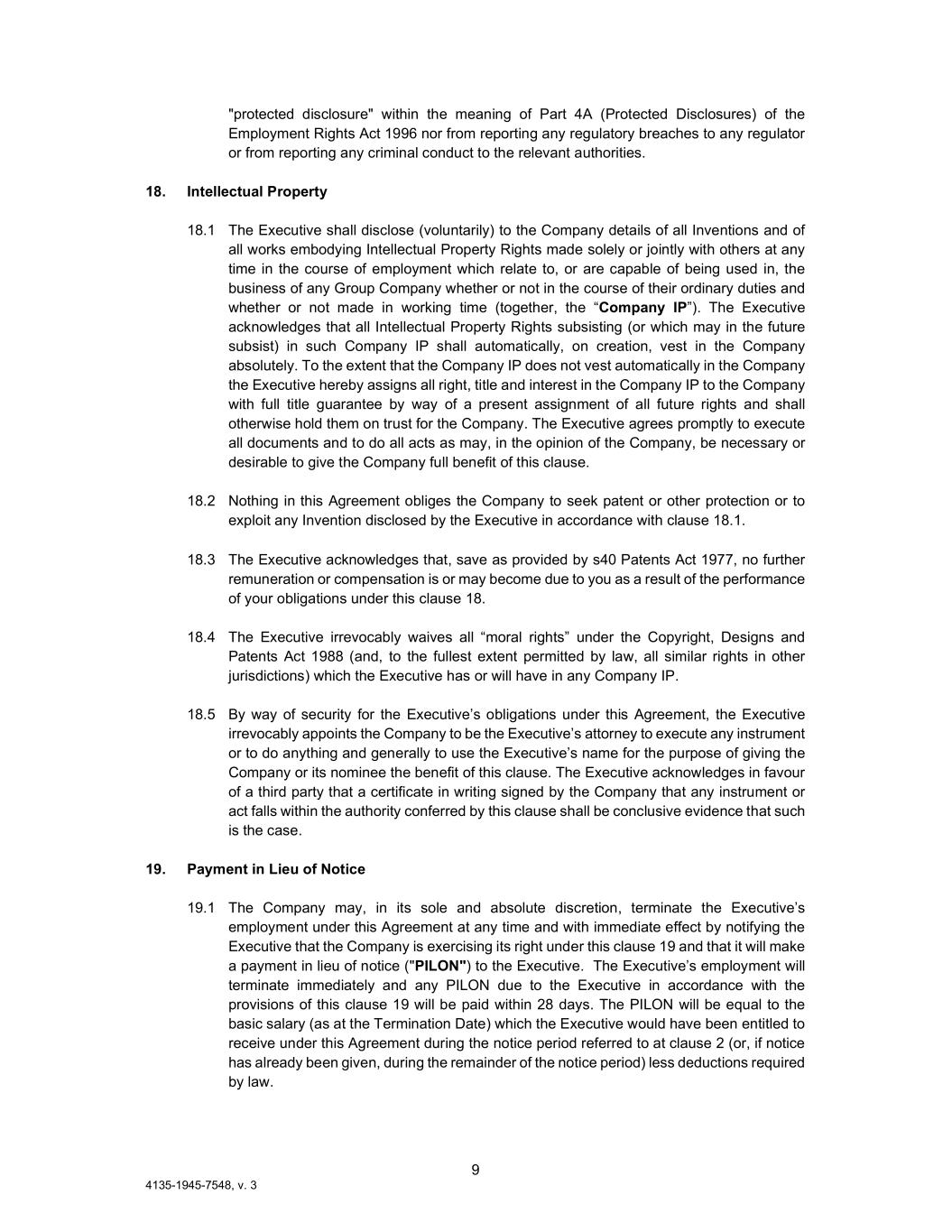 9  4135-1945-7548, v. 3  "protected disclosure" within the meaning of Part 4A (Protected Disclosures) of the  Employment Rights Act 1996 nor from reporting any regulatory breaches to any regulator  or from reporting any criminal conduct to the relevant authorities.     18. Intellectual Property    18.1 The Executive shall disclose (voluntarily) to the Company details of all Inventions and of  all works embodying Intellectual Property Rights made solely or jointly with others at any  time in the course of employment which relate to, or are capable of being used in, the  business of any Group Company whether or not in the course of their ordinary duties and  whether or not made in working time (together, the “Company IP”). The Executive  acknowledges that all Intellectual Property Rights subsisting (or which may in the future  subsist) in such Company IP shall automatically, on creation, vest in the Company  absolutely. To the extent that the Company IP does not vest automatically in the Company  the Executive hereby assigns all right, title and interest in the Company IP to the Company  with full title guarantee by way of a present assignment of all future rights and shall  otherwise hold them on trust for the Company. The Executive agrees promptly to execute  all documents and to do all acts as may, in the opinion of the Company, be necessary or  desirable to give the Company full benefit of this clause.    18.2 Nothing in this Agreement obliges the Company to seek patent or other protection or to  exploit any Invention disclosed by the Executive in accordance with clause 18.1.    18.3 The Executive acknowledges that, save as provided by s40 Patents Act 1977, no further  remuneration or compensation is or may become due to you as a result of the performance  of your obligations under this clause 18.    18.4 The Executive irrevocably waives all “moral rights” under the Copyright, Designs and  Patents Act 1988 (and, to the fullest extent permitted by law, all similar rights in other  jurisdictions) which the Executive has or will have in any Company IP.    18.5 By way of security for the Executive’s obligations under this Agreement, the Executive  irrevocably appoints the Company to be the Executive’s attorney to execute any instrument  or to do anything and generally to use the Executive’s name for the purpose of giving the  Company or its nominee the benefit of this clause. The Executive acknowledges in favour  of a third party that a certificate in writing signed by the Company that any instrument or  act falls within the authority conferred by this clause shall be conclusive evidence that such  is the case.    19. Payment in Lieu of Notice    19.1 The Company may, in its sole and absolute discretion, terminate the Executive’s  employment under this Agreement at any time and with immediate effect by notifying the  Executive that the Company is exercising its right under this clause 19 and that it will make  a payment in lieu of notice ("PILON") to the Executive.  The Executive’s employment will  terminate immediately and any PILON due to the Executive in accordance with the  provisions of this clause 19 will be paid within 28 days. The PILON will be equal to the  basic salary (as at the Termination Date) which the Executive would have been entitled to  receive under this Agreement during the notice period referred to at clause 2 (or, if notice  has already been given, during the remainder of the notice period) less deductions required  by law.