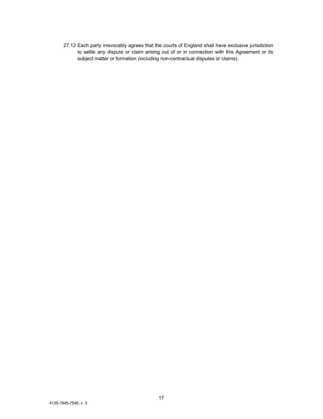 17  4135-1945-7548, v. 3    27.12 Each party irrevocably agrees that the courts of England shall have exclusive jurisdiction  to settle any dispute or claim arising out of or in connection with this Agreement or its  subject matter or formation (including non-contractual disputes or claims).