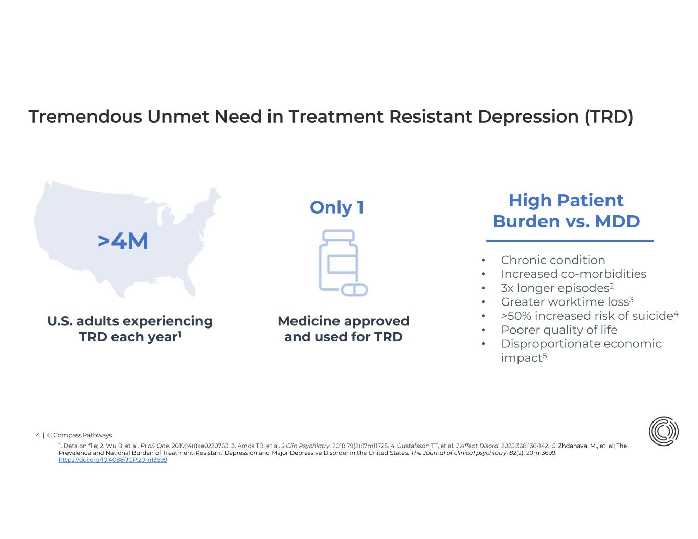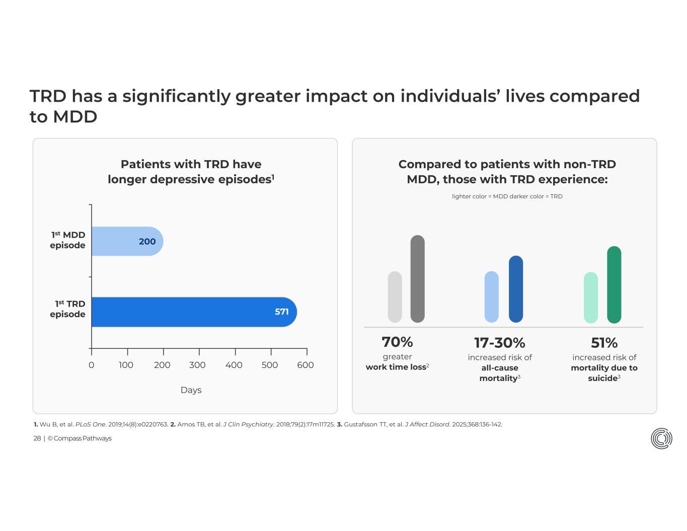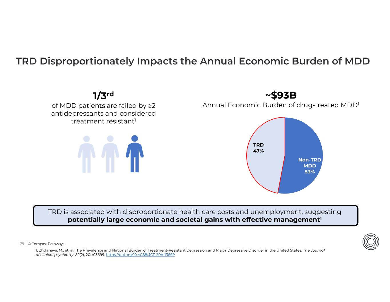 28 | © Compass Pathways 1. Wu B, et al. PLoS One. 2019;14(8):e0220763. 2. Amos TB, et al. J Clin Psychiatry. 2018;79(2):17m11725. 3. Gustafsson TT, et al. J Affect Disord. 2025;368:136-142. TRD has a significantly greater impact on individuals’ lives compared to MDD Patients with TRD have longer depressive episodes1 17-30% increased risk of all-cause mortality3 70% greater work time loss2 51% increased risk of mortality due to suicide3 1st MDD episode 1st TRD episode 571 6005004003002001000 Days 200 Compared to patients with non-TRD MDD, those with TRD experience: lighter color = MDD darker color = TRD