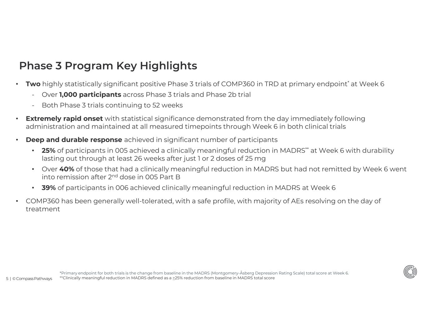 4 | © Compass Pathways Tremendous Unmet Need in Treatment Resistant Depression (TRD) >4M U.S. adults experiencing TRD each year1 Only 1 Medicine approved and used for TRD High Patient Burden vs. MDD • Chronic condition • Increased co-morbidities • 3x longer episodes2 • Greater worktime loss3 • >50% increased risk of suicide4 • Poorer quality of life • Disproportionate economic impact5 1. Data on file; 2. Wu B, et al. PLoS One. 2019;14(8):e0220763. 3. Amos TB, et al. J Clin Psychiatry. 2018;79(2):17m11725. 4. Gustafsson TT, et al. J Affect Disord. 2025;368:136-142.; 5. Zhdanava, M., et. al; The Prevalence and National Burden of Treatment-Resistant Depression and Major Depressive Disorder in the United States. The Journal of clinical psychiatry, 82(2), 20m13699. https://doi.org/10.4088/JCP.20m13699