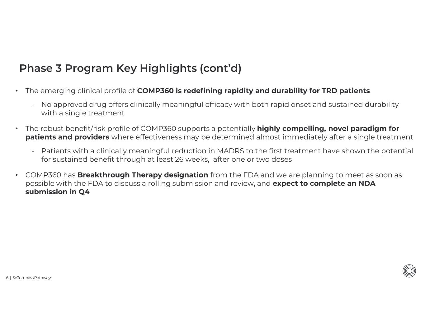 2 | © Compass Pathways Cautionary Note Regarding Forward-Looking Statements This presentation includes “forward-looking statements” within the meaning of the Private Securities Litigation Reform Act of 1995, as amended. In some cases, you can identify forward-looking statements by terms such as “believe,” “continue,” “could,” “estimate,” “expect,” “may,” “might,” “plan,” “potential,” “project,” “target,” “will,” “would,” or the negative of these terms, and similar expressions intended to identify forward-looking statements. However, not all forward-looking statements contain these identifying words. These forward-looking statements include express or implied statements relating to, among other things, statements regarding our business strategy and goals; our expectations and projections about the company’s future cash needs and financial results; our expectations regarding the safety or efficacy of our investigational COMP360 psilocybin treatment, including as a treatment for treatment of TRD or PTSD; our plans and expectations regarding our clinical trials, including our phase 3 trials in TRD and our phase 2b/3 trial in PTSD; our expectations regarding the time periods for the release of data from Part B of the COMP006 Phase 3 trial for TRD; our expectations regarding discussions with the FDA, including discussions regarding potential NDA acceleration strategies, including potential for rolling NDA submission and review for COMP360 psilocybin treatment in TRD; our expectations regarding potential commercial launch timelines and our commercial readiness; the potential for the pivotal phase 3 program in TRD to support regulatory filings and approvals on an accelerated basis or at all; our ability to obtain regulatory approval and adequate coverage and reimbursement; our ability to transition from a clinical-stage to a commercial-stage organization and effectively launch a commercial product, if regulatory approval is obtained, on an accelerated timeline or at all; our expectations regarding the commercial potential for COMP360 and our expectations regarding the benefits of our investigational COMP360 psilocybin treatment. The forward-looking statements in this press release are neither promises nor guarantees, and you should not place undue reliance on these forward-looking statements because they involve known and unknown risks, uncertainties, and other factors, many of which are beyond Compass’s control and which could cause actual results, levels of activity, performance or achievements to differ materially from those expressed or implied by these forward-looking statements. These risks, uncertainties, and other factors include, among others: uncertainties associated with risks related to clinical development which is a lengthy and expensive process with uncertain outcomes, and therefore our clinical trials may be delayed or terminated and may be more costly than expected; the full results and safety data from our Phase 3 clinical trials in TRD may not be consistent with the preliminary results to date; our need for substantial additional funding to achieve our business goals and if we are unable to obtain this funding when needed and on acceptable terms, we could be forced to delay, limit or terminate our clinical trials; our acceleration strategies for our NDA submission may not be successful; FDA may ultimately disagree with our proposal for a rolling NDA submission and may not permit us to utilize the rolling review process; our efforts to obtain marketing approval from FDA or regulatory authorities in any other jurisdiction for our investigational COMP360 psilocybin treatment may be unsuccessful; our efforts to commercialize and obtain coverage and reimbursement for our investigational COMP360 psilocybin treatment, if approved, may be unsuccessful; the risk that our strategic collaborations will not continue or will not be successful; and our ability to retain key personnel; and those risks and uncertainties described under the heading “Risk Factors” in Compass’s most recent annual report on Form 10-K or quarterly report on Form 10-Q, and in other reports we have filed with the U.S. Securities and Exchange Commission (“SEC”), which are available on the SEC’s website at www.sec.gov. You should not rely upon forward-looking statements as predictions of future events. Although our management believes that the expectations reflected in our statements are reasonable, we cannot guarantee that the future results, levels of activity, performance or events and circumstances described in the forward-looking statements will be achieved or occur. Moreover, neither we, nor any other person, assumes responsibility for the accuracy and completeness of these statements. Accordingly, you are cautioned not to place undue reliance on these forward-looking statements, which speak only as of the date such statements are made and should not be construed as statements of fact. Except as required by applicable law, we undertake no obligation to update these forward-looking statements to reflect any new information, events or circumstances after the date hereof, or to reflect the occurrence of unanticipated events. No representations or warranties (expressed or implied) are made about the accuracy of any such forward-looking statements. Market & Industry Data Market & industry data projections, estimates, industry data and information contained in this presentation, including our general expectations about our market position and market opportunity, are based on information from third-party sources, publicly available information, our knowledge of our industry and assumptions based on such information and knowledge. Although we believe that our third party-sources are reliable, we cannot guarantee the accuracy or completeness of our sources. All of the projections, estimates, market data and industry information used in this presenta