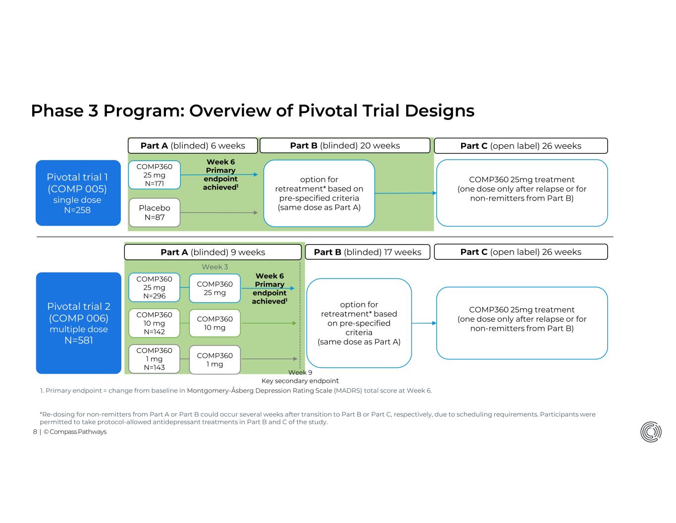 8 | © Compass Pathways Phase 3 Program: Overview of Pivotal Trial Designs Pivotal trial 1 (COMP 005) single dose N=258 COMP360 25 mg N=171 Pivotal trial 2 (COMP 006) multiple dose N=581 COMP360 25 mg N=296 COMP360 1 mg N=143 COMP360 25 mg COMP360 1 mg COMP360 10 mg N=142 COMP360 10 mg Week 3 Week 6 Primary endpoint achieved1 option for retreatment* based on pre-specified criteria (same dose as Part A) COMP360 25mg treatment (one dose only after relapse or for non-remitters from Part B) Part A (blinded) 6 weeks Part B (blinded) 20 weeks Part C (open label) 26 weeks Placebo N=87 option for retreatment* based on pre-specified criteria (same dose as Part A) COMP360 25mg treatment (one dose only after relapse or for non-remitters from Part B) Part A (blinded) 9 weeks Part B (blinded) 17 weeks Part C (open label) 26 weeks 1. Primary endpoint = change from baseline in Montgomery-Åsberg Depression Rating Scale (MADRS) total score at Week 6. Week 9 Key secondary endpoint Week 6 Primary endpoint achieved1 *Re-dosing for non-remitters from Part A or Part B could occur several weeks after transition to Part B or Part C, respectively, due to scheduling requirements. Participants were permitted to take protocol-allowed antidepressant treatments in Part B and C of the study.