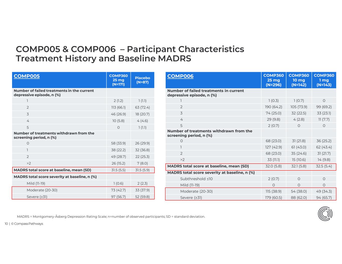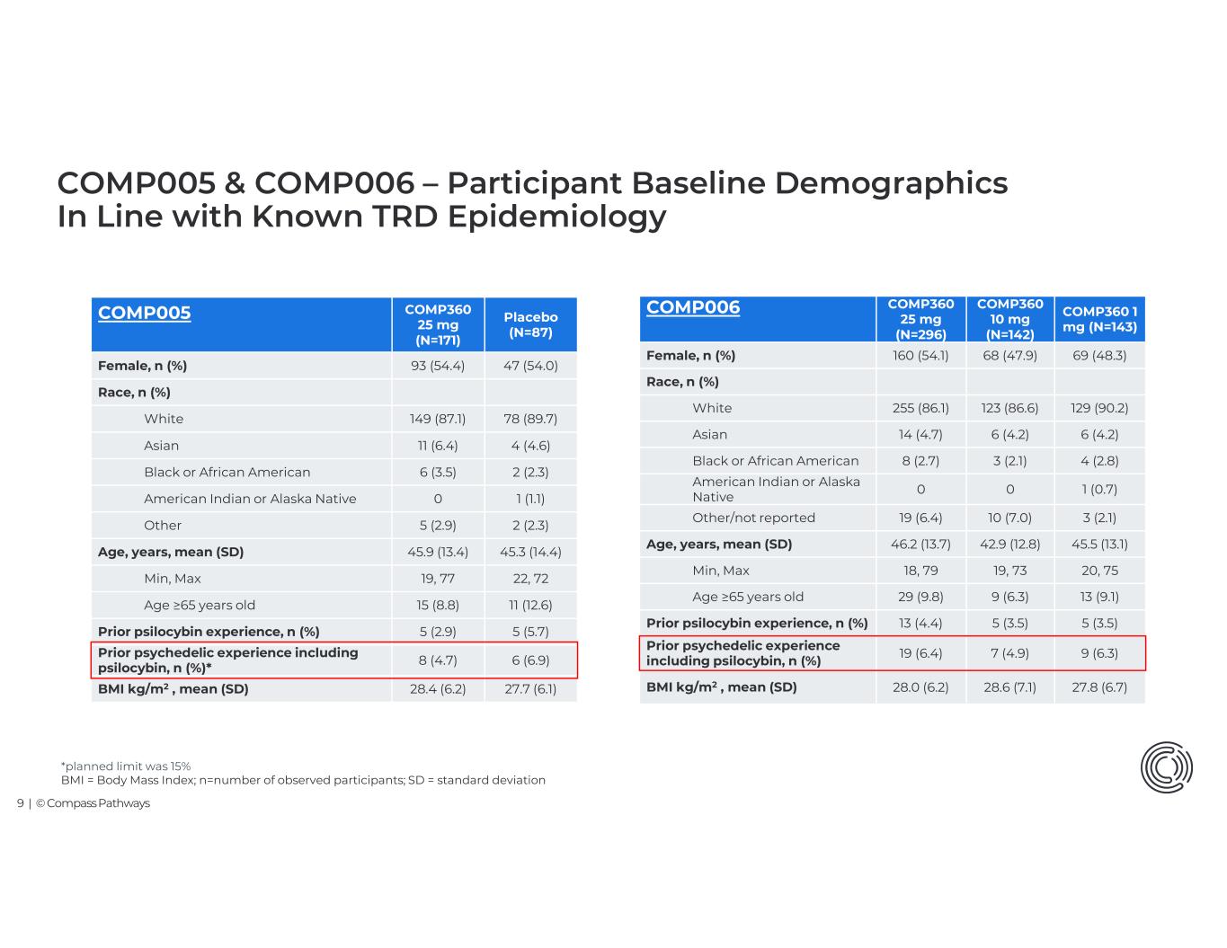 9 | © Compass Pathways Placebo (N=87) COMP360 25 mg (N=171) COMP005 47 (54.0)93 (54.4)Female, n (%) Race, n (%) 78 (89.7)149 (87.1)White 4 (4.6)11 (6.4)Asian 2 (2.3)6 (3.5)Black or African American 1 (1.1)0American Indian or Alaska Native 2 (2.3)5 (2.9)Other 45.3 (14.4)45.9 (13.4)Age, years, mean (SD) 22, 7219, 77Min, Max 11 (12.6)15 (8.8)Age ≥65 years old 5 (5.7)5 (2.9)Prior psilocybin experience, n (%) 6 (6.9)8 (4.7)Prior psychedelic experience including psilocybin, n (%)* 27.7 (6.1)28.4 (6.2)BMI kg/m2 , mean (SD) *planned limit was 15% BMI = Body Mass Index; n=number of observed participants; SD = standard deviation COMP005 & COMP006 – Participant Baseline Demographics In Line with Known TRD Epidemiology COMP360 1 mg (N=143) COMP360 10 mg (N=142) COMP360 25 mg (N=296) COMP006 69 (48.3)68 (47.9)160 (54.1)Female, n (%) Race, n (%) 129 (90.2)123 (86.6)255 (86.1)White 6 (4.2)6 (4.2)14 (4.7)Asian 4 (2.8)3 (2.1)8 (2.7)Black or African American 1 (0.7)00American Indian or Alaska Native 3 (2.1)10 (7.0)19 (6.4)Other/not reported 45.5 (13.1)42.9 (12.8)46.2 (13.7)Age, years, mean (SD) 20, 7519, 7318, 79Min, Max 13 (9.1)9 (6.3)29 (9.8)Age ≥65 years old 5 (3.5)5 (3.5)13 (4.4)Prior psilocybin experience, n (%) 9 (6.3)7 (4.9)19 (6.4)Prior psychedelic experience including psilocybin, n (%) 27.8 (6.7)28.6 (7.1)28.0 (6.2)BMI kg/m2 , mean (SD)
