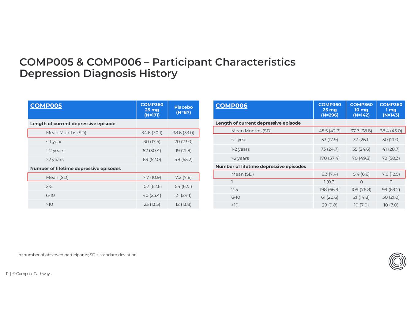 10 | © Compass Pathways MADRS = Montgomery-Åsberg Depression Rating Scale; n=number of observed participants; SD = standard deviation. Placebo (N=87) COMP360 25 mg (N=171) COMP005 Number of failed treatments in the current depressive episode, n (%) 1 (1.1)2 (1.2)1 63 (72.4)113 (66.1)2 18 (20.7)46 (26.9)3 4 (4.6)10 (5.8)4 1 (1.1)05 Number of treatments withdrawn from the screening period, n (%) 26 (29.9)58 (33.9)0 32 (36.8)38 (22.2)1 22 (25.3)49 (28.7)2 7 (8.0)26 (15.2)>2 31.5 (5.9)31.5 (5.5)MADRS total score at baseline, mean (SD) MADRS total score severity at baseline, n (%) 2 (2.3)1 (0.6)Mild (11-19) 33 (37.9)73 (42.7)Moderate (20-30) 52 (59.8)97 (56.7)Severe (≥31) COMP005 & COMP006 – Participant Characteristics Treatment History and Baseline MADRS COMP360 1 mg (N=143) COMP360 10 mg (N=142) COMP360 25 mg (N=296) COMP006 Number of failed treatments in current depressive episode, n (%) 01 (0.7)1 (0.3)1 99 (69.2)105 (73.9)190 (64.2)2 33 (23.1)32 (22.5)74 (25.0)3 11 (7.7)4 (2.8)29 (9.8)4 002 (0.7)5 Number of treatments withdrawn from the screening period, n (%) 36 (25.2)31 (21.8)68 (23.0)0 62 (43.4)61 (43.0)127 (42.9)1 31 (21.7)35 (24.6)68 (23.0)2 14 (9.8)15 (10.6)33 (11.1)>2 32.5 (5.4)32.1 (5.8)32.0 (5.8)MADRS total score at baseline, mean (SD) MADRS total score severity at baseline, n (%) 002 (0.7)Subthreshold ≤10 000Mild (11-19) 49 (34.3)54 (38.0)115 (38.9)Moderate (20-30) 94 (65.7)88 (62.0)179 (60.5)Severe (≥31)