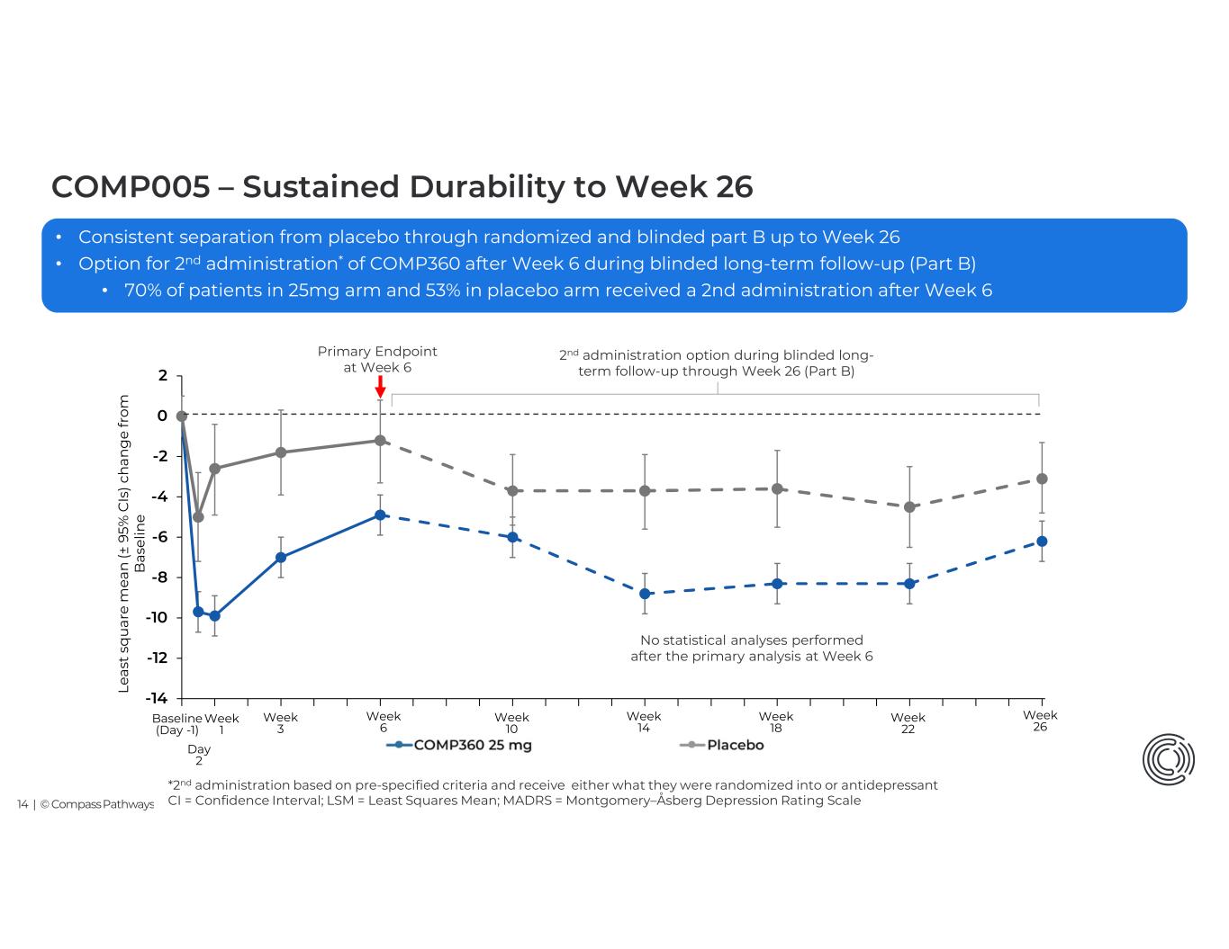 13 | © Compass Pathways COMP005 - Primary Endpoint Achieved – Change in MADRS at Week 6 CI = Confidence Interval; LSM = Least Squares Mean; MADRS = Montgomery–Åsberg Depression Rating Scale; SD=standard deviation. LS Mean Difference (95% CI) P-value Visit -4.7 (-7.0, -2.3), p<0.001 Day 2 -7.2 (-9.6, -4.8), p<0.001 Week 1 -5.2 (-7.4, -2.9), p<0.001 Week 3 -3.6 (-5.7, -1.5), p<0.001 Week 6 (Primary) • Highly statistically significant difference of -3.6 MADRS between 25mg vs placebo at Week 6 (p<0.001) • Statistical significance at all timepoints beginning the day after administration (Day 2) demonstrates rapid onset of action Baseline mean (SD): 25 mg (n=171) = 31.5 (5.5) Placebo (n=87) = 31.5 (5.9) -4.9 (-6.3, -3.4) -1.2 (-3.3, 0.8) -1.8 (-3.9, 0.3) -7.0 (-8.5, -5.4) -9.9 (-11.5, -8.2) -2.6 (-4.9, -0.4) -5.0 (-7.2, -2.8) -9.7 (-11.2, -8.1)