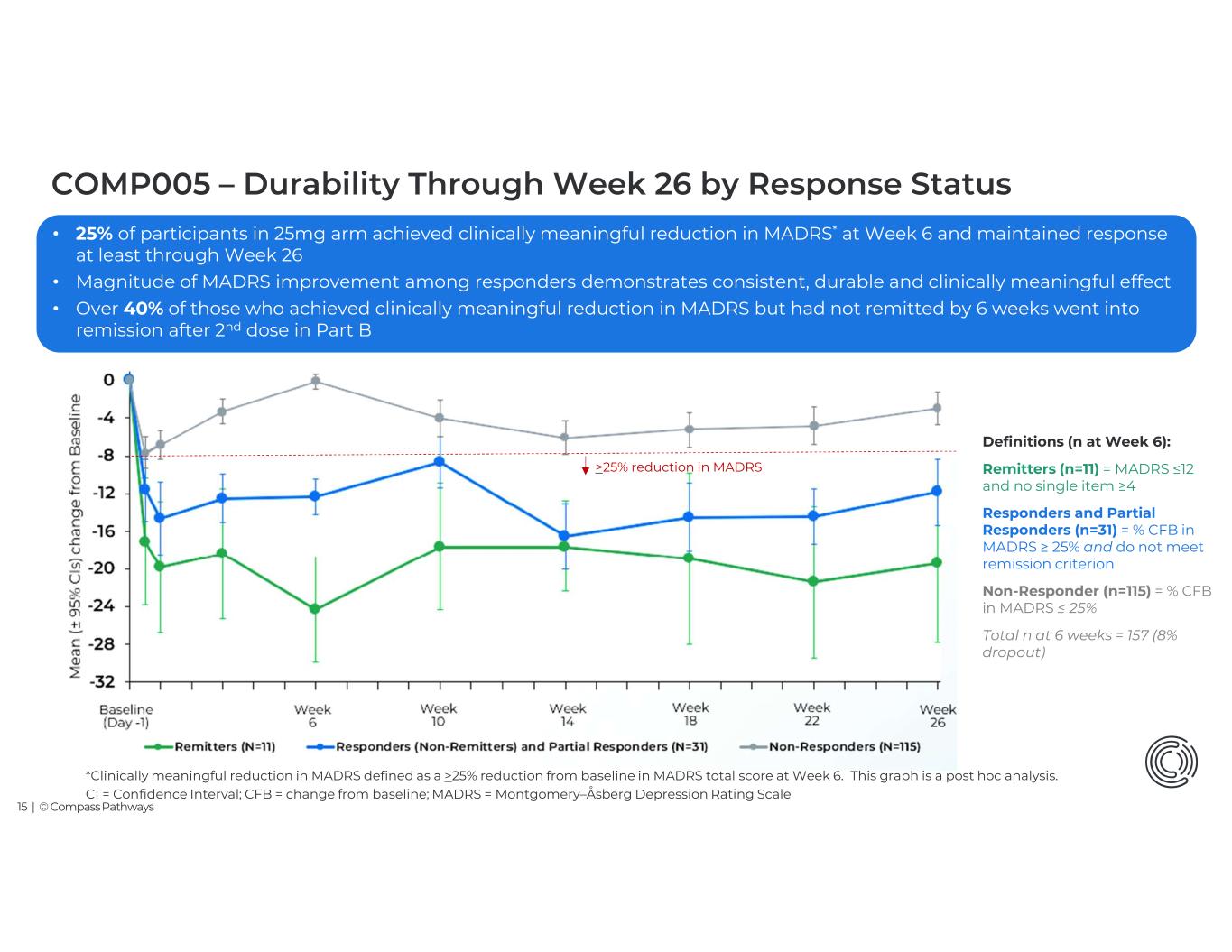 14 | © Compass Pathways COMP005 – Sustained Durability to Week 26 Source: Post Hoc (Include Number) Note: : CI = Confidence Interval; LSM = Least Squares Mean; MADRS = Montgomery–Åsberg Depression Rating Scale. • Consistent separation from placebo through randomized and blinded part B up to Week 26 • Option for 2nd administration* of COMP360 after Week 6 during blinded long-term follow-up (Part B) • 70% of patients in 25mg arm and 53% in placebo arm received a 2nd administration after Week 6 -14 -12 -10 -8 -6 -4 -2 0 2 Baseline (Day -1) Day 2 Week 1 Week 3 Week 6 Le as t sq u ar e m ea n (± 95 % C Is ) c h an g e fr o m B as e lin e Week 10 Week 14 Primary Endpoint at Week 6 No statistical analyses performed after the primary analysis at Week 6 Week 18 Week 22 Week 26 2nd administration option during blinded long- term follow-up through Week 26 (Part B) *2nd administration based on pre-specified criteria and receive either what they were randomized into or antidepressant CI = Confidence Interval; LSM = Least Squares Mean; MADRS = Montgomery–Åsberg Depression Rating Scale