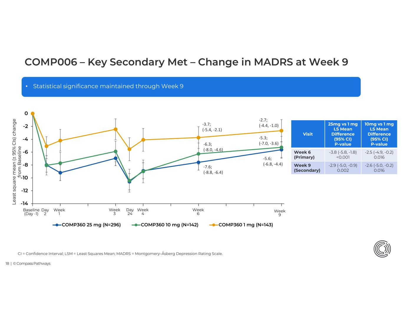 17 | © Compass Pathways -14 -12 -10 -8 -6 -4 -2 0 COMP360 25 mg (N=296) COMP360 10 mg (N=142) COMP360 1 mg (N=143) 10mg vs 1 mg LS Mean Difference (95% CI) P-value 25mg vs 1 mg LS Mean Difference (95% CI) P-value Visit -3.0 (-5.0, -1.0) 0.002 -2.9 (-4.6, -1.2) <0.001 Day 2 -3.6 (-5.9, -1.2) 0.001 -5.0 (-7.0, -3.0) <0.001 Week 1 -3.4 (-5.6, -1.2) 0.001 -4.5 (-6.4, -2.5) <0.001 Week 3 -4.9 (-7.4, -2.4) <0.001 -5.0 (-7.1, -2.9) <0.001 Day 24 -4.9 (-7.3, -2.5) <0.001 -4.8 (-6.9, -2.7) <0.001 Week 4 -2.5 (-4.9, -0.2) 0.016 -3.8 (-5.8, -1.8) <0.001 Week 6 (Primary) • Statistically significant difference of -3.8 MADRS between 25mg vs 1mg at Week 6 (p<0.001) • Statistically significant treatment differences in 25mg vs 1mg and 10mg vs 1 mg found at all timepoints post administration • Rapid onset of action with the effect occurring the day after the administration (Day 2) • 39% of participants in 25mg arm achieved a clinically meaningful reduction in MADRS at Week 6* Baseline mean (SD): 25 mg (n=296) = 32.0 (5.8) 10 mg (n=142) = 32.1 (5.8) 1 mg (n=143) = 32.5 (5.4) Baseline (Day -1) Day 2 Week 1 Week 3 Day 24 Week 4 Week 6 -7.6; (-8.8, -6.4) Le as t sq u ar e m ea n (± 95 % C Is ) c h an g e fr o m B as e lin e -6.3; (-8.0, -4.6) -3.7; (-5.4, -2.1) *Clinically meaningful reduction in MADRS defined as a >25% reduction from baseline in MADRS total score at Week 6 CI = Confidence Interval; LSM = Least Squares Mean; MADRS = Montgomery–Åsberg Depression Rating Scale COMP006 – Primary Endpoint Met – Change in MADRS at Week 6