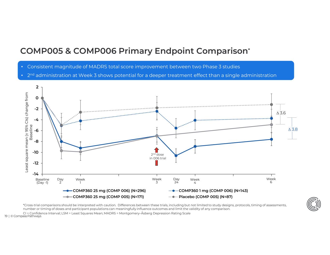 18 | © Compass Pathways CI = Confidence Interval; LSM = Least Squares Mean; MADRS = Montgomery–Åsberg Depression Rating Scale. 10mg vs 1 mg LS Mean Difference (95% CI) P-value 25mg vs 1 mg LS Mean Difference (95% CI) P-value Visit -2.5 (-4.9, -0.2) 0.016 -3.8 (-5.8, -1.8) <0.001 Week 6 (Primary) -2.6 (-5.0, -0.2) 0.016 -2.9 (-5.0, -0.9) 0.002 Week 9 (Secondary) • Statistical significance maintained through Week 9 -14 -12 -10 -8 -6 -4 -2 0 COMP360 25 mg (N=296) COMP360 10 mg (N=142) COMP360 1 mg (N=143) Baseline (Day -1) Day 2 Week 1 Week 3 Week 9 Day 24 Week 4 Week 6 -7.6; (-8.8, -6.4) Le as t sq u ar e m ea n (± 95 % C Is ) c h an g e fr o m B as e lin e -6.3; (-8.0, -4.6) -3.7; (-5.4, -2.1) -2.7; (-4.4, -1.0) -5.3; (-7.0, -3.6) -5.6; (-6.8, -4.4) COMP006 – Key Secondary Met – Change in MADRS at Week 9