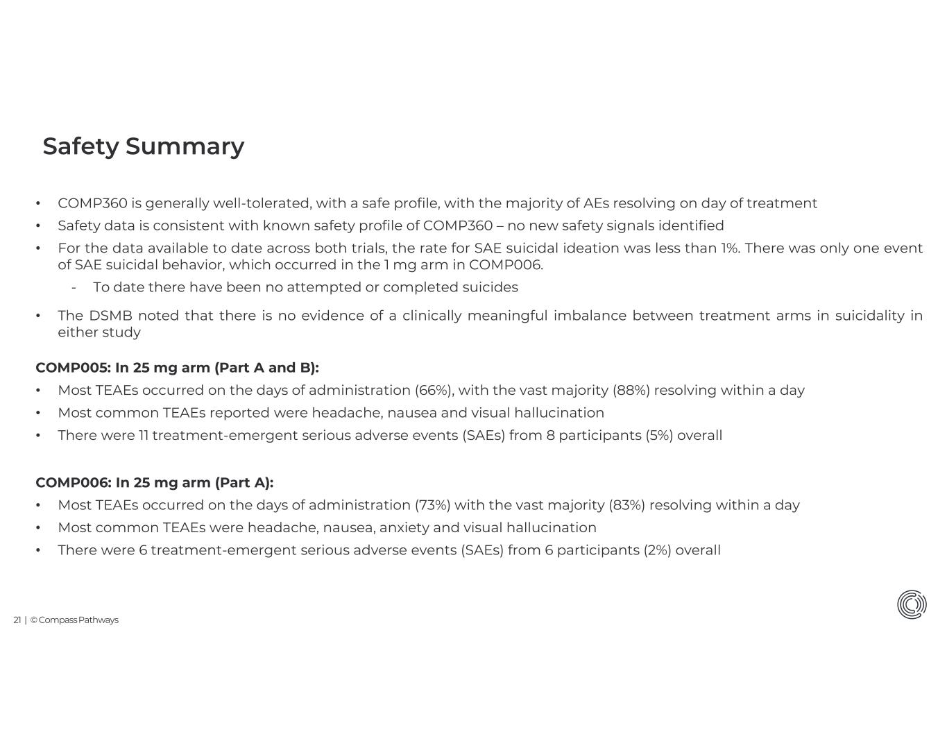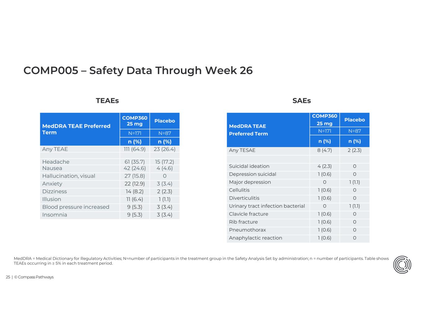 24 | © Compass Pathways n = number of participants with TESAE; TESAE = treatment emergent serious adverse event COMP360 1 mg COMP360 10 mg COMP360 25 mg COMP006 N=143N=142N=296 n (%)n (%) n (%) 5 (3.5)1 (0.7)6 (2.0)Any SAE 2 (1.4)1 (0.7)0Suicidal ideation 1 (0.7)00Suicidal behaviour 1 (0.7)01 (0.3)Syncope 001 (0.3)Major depression 001 (0.3)Anxiety 001 (0.3)Flashback 001 (0.3)Cervical spinal stenosis 1 (0.7)00Renal neoplasm 001 (0.3)Pelvic pain PlaceboCOMP360 25 mg COMP005 N=87N=171 n (%) n (%) 1 (1.1)4 (2.3)Any SAE 02 (1.2)Suicidal ideation 01 (0.6)Depression suicidal 1 (1.1)0Major depression 01 (0.6)Cellulitis 01 (0.6)Diverticulitis Note: COMP006 safety includes 2 dose administrations and goes out to 9 weeks vs. 1 administration out to 6 weeks for COMP005 COMP005 & COMP006 Treatment-Emergent Serious Adverse Events (SAEs) for Part A