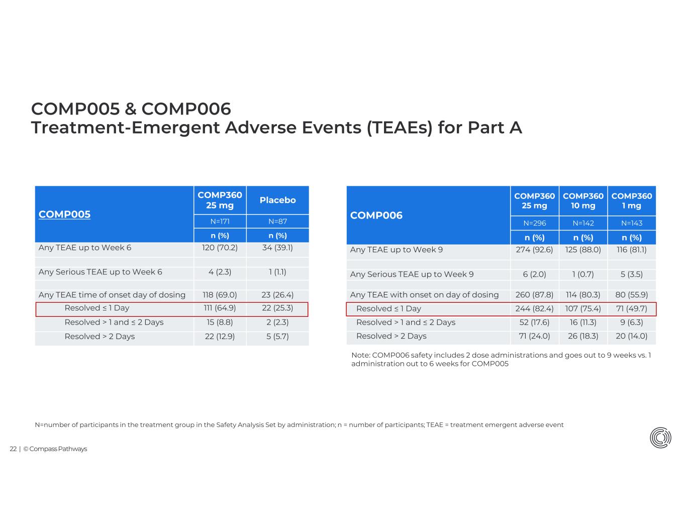 21 | © Compass Pathways Safety Summary • COMP360 is generally well-tolerated, with a safe profile, with the majority of AEs resolving on day of treatment • Safety data is consistent with known safety profile of COMP360 – no new safety signals identified • For the data available to date across both trials, the rate for SAE suicidal ideation was less than 1%. There was only one event of SAE suicidal behavior, which occurred in the 1 mg arm in COMP006. - To date there have been no attempted or completed suicides • The DSMB noted that there is no evidence of a clinically meaningful imbalance between treatment arms in suicidality in either study COMP005: In 25 mg arm (Part A and B): • Most TEAEs occurred on the days of administration (66%), with the vast majority (88%) resolving within a day • Most common TEAEs reported were headache, nausea and visual hallucination • There were 11 treatment-emergent serious adverse events (SAEs) from 8 participants (5%) overall COMP006: In 25 mg arm (Part A): • Most TEAEs occurred on the days of administration (73%) with the vast majority (83%) resolving within a day • Most common TEAEs were headache, nausea, anxiety and visual hallucination • There were 6 treatment-emergent serious adverse events (SAEs) from 6 participants (2%) overall