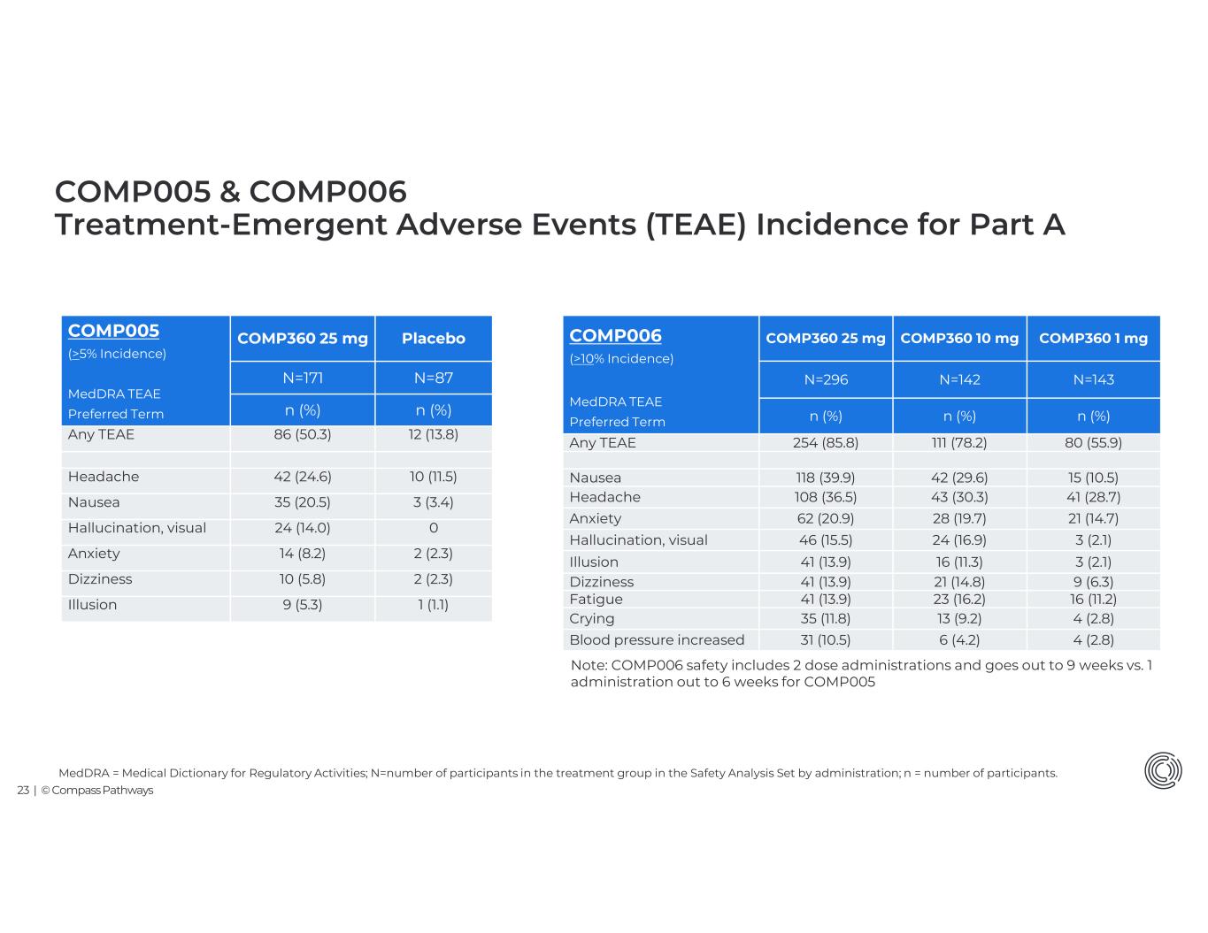 22 | © Compass Pathways N=number of participants in the treatment group in the Safety Analysis Set by administration; n = number of participants; TEAE = treatment emergent adverse event PlaceboCOMP360 25 mg COMP005 N=87N=171 n (%) n (%) 34 (39.1)120 (70.2)Any TEAE up to Week 6 1 (1.1)4 (2.3)Any Serious TEAE up to Week 6 23 (26.4)118 (69.0)Any TEAE time of onset day of dosing 22 (25.3)111 (64.9)Resolved ≤ 1 Day 2 (2.3)15 (8.8)Resolved > 1 and ≤ 2 Days 5 (5.7)22 (12.9)Resolved > 2 Days COMP360 1 mg COMP360 10 mg COMP360 25 mg COMP006 N=143N=142N=296 n (%)n (%) n (%) 116 (81.1)125 (88.0)274 (92.6)Any TEAE up to Week 9 5 (3.5)1 (0.7)6 (2.0)Any Serious TEAE up to Week 9 80 (55.9)114 (80.3)260 (87.8)Any TEAE with onset on day of dosing 71 (49.7)107 (75.4)244 (82.4)Resolved ≤ 1 Day 9 (6.3)16 (11.3)52 (17.6)Resolved > 1 and ≤ 2 Days 20 (14.0)26 (18.3)71 (24.0)Resolved > 2 Days Note: COMP006 safety includes 2 dose administrations and goes out to 9 weeks vs. 1 administration out to 6 weeks for COMP005 COMP005 & COMP006 Treatment-Emergent Adverse Events (TEAEs) for Part A