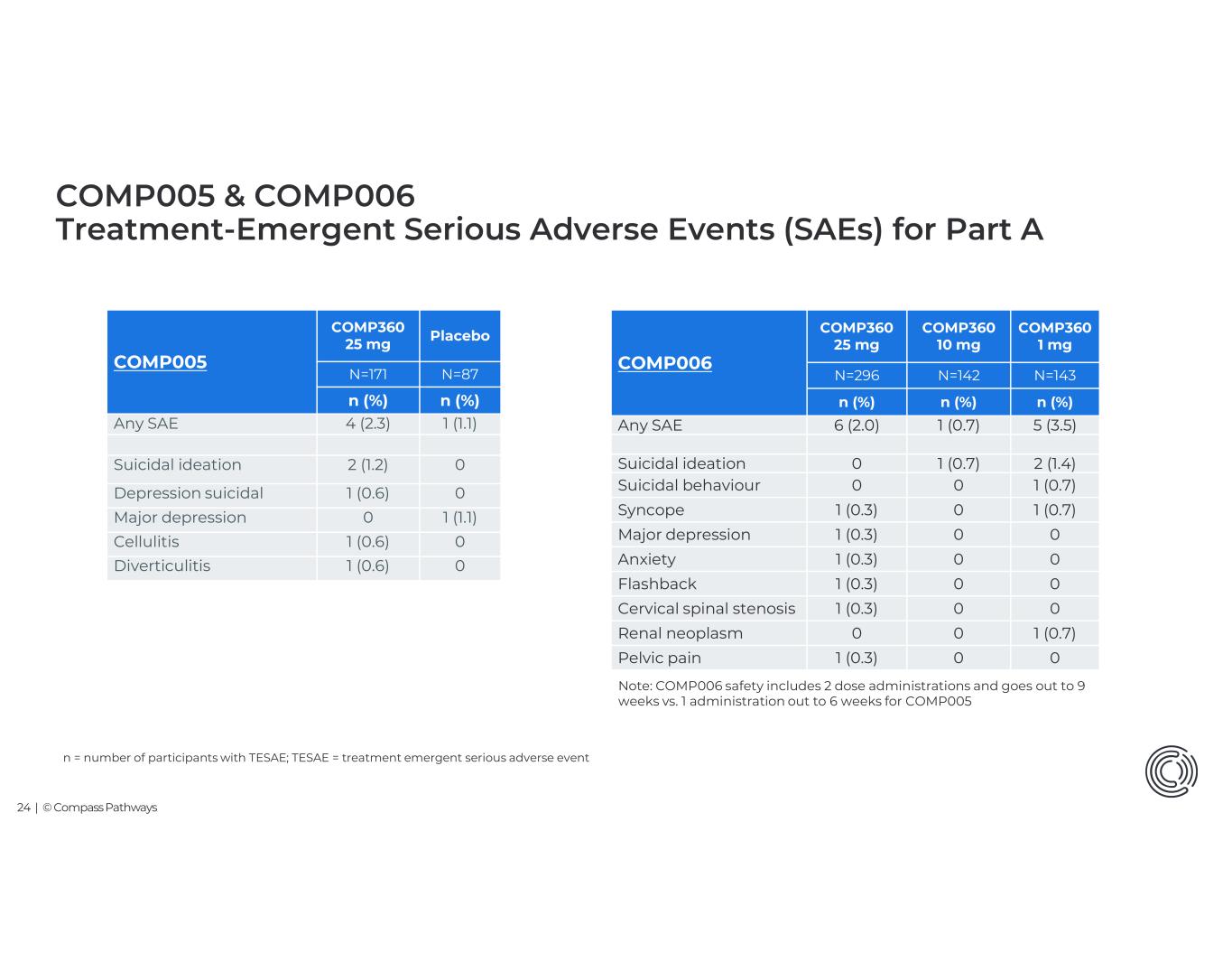 23 | © Compass Pathways MedDRA = Medical Dictionary for Regulatory Activities; N=number of participants in the treatment group in the Safety Analysis Set by administration; n = number of participants. PlaceboCOMP360 25 mgCOMP005 (>5% Incidence) MedDRA TEAE Preferred Term N=87N=171 n (%) n (%) 12 (13.8)86 (50.3)Any TEAE 10 (11.5)42 (24.6)Headache 3 (3.4)35 (20.5)Nausea 024 (14.0)Hallucination, visual 2 (2.3)14 (8.2)Anxiety 2 (2.3)10 (5.8)Dizziness 1 (1.1)9 (5.3)Illusion COMP360 1 mgCOMP360 10 mgCOMP360 25 mgCOMP006 (>10% Incidence) MedDRA TEAE Preferred Term N=143N=142N=296 n (%)n (%) n (%) 80 (55.9)111 (78.2)254 (85.8)Any TEAE 15 (10.5)42 (29.6)118 (39.9)Nausea 41 (28.7)43 (30.3)108 (36.5)Headache 21 (14.7)28 (19.7)62 (20.9)Anxiety 3 (2.1)24 (16.9)46 (15.5)Hallucination, visual 3 (2.1)16 (11.3)41 (13.9)Illusion 9 (6.3)21 (14.8)41 (13.9)Dizziness 16 (11.2)23 (16.2)41 (13.9)Fatigue 4 (2.8)13 (9.2)35 (11.8)Crying 4 (2.8)6 (4.2)31 (10.5)Blood pressure increased Note: COMP006 safety includes 2 dose administrations and goes out to 9 weeks vs. 1 administration out to 6 weeks for COMP005 COMP005 & COMP006 Treatment-Emergent Adverse Events (TEAE) Incidence for Part A