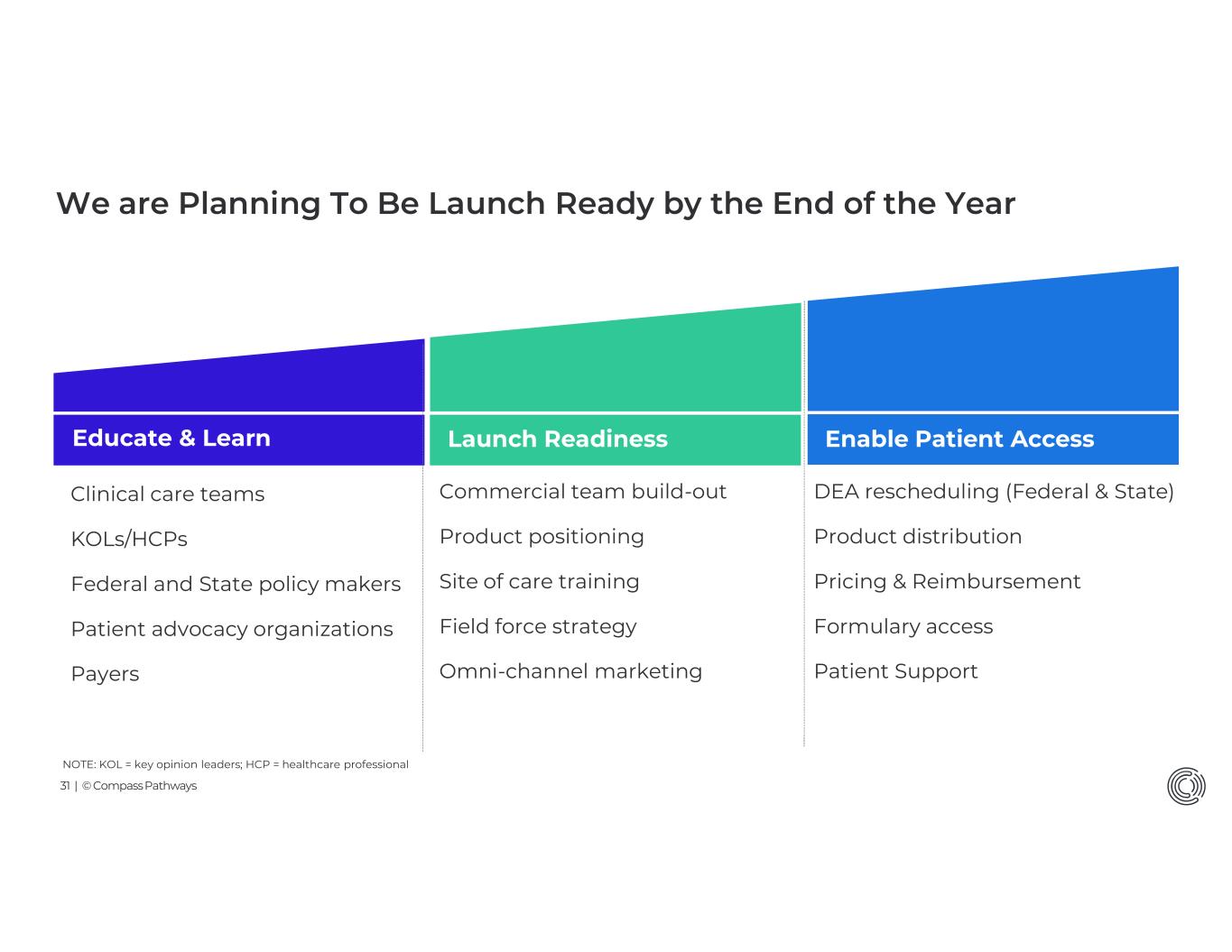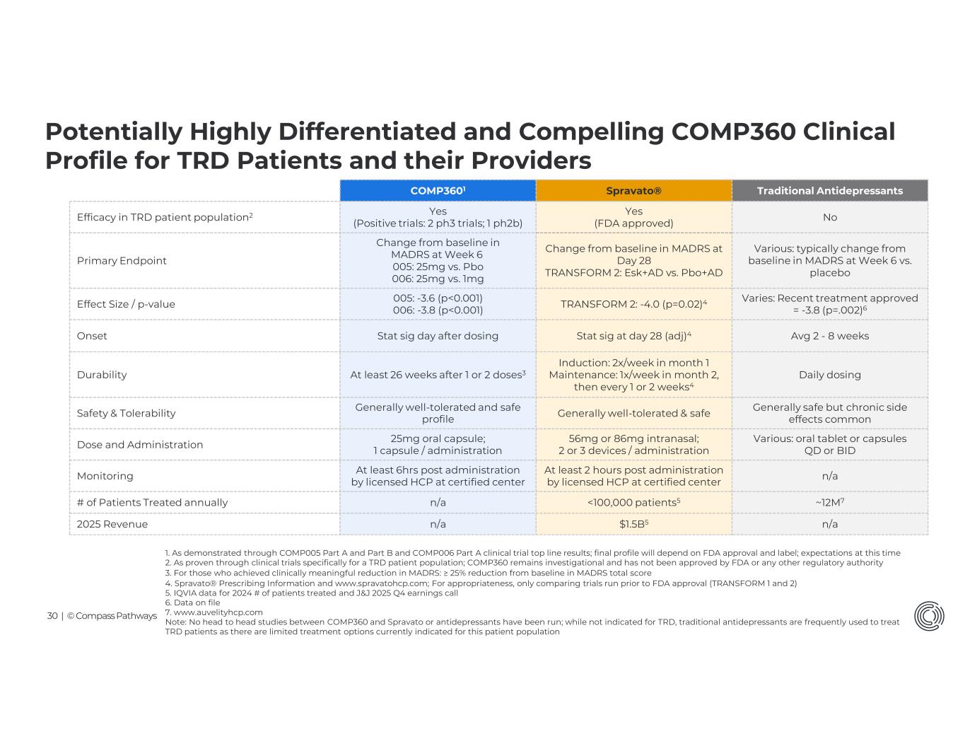 30 | © Compass Pathways Potentially Highly Differentiated and Compelling COMP360 Clinical Profile for TRD Patients and their Providers Traditional AntidepressantsSpravato®COMP3601 NoYes (FDA approved) Yes (Positive trials: 2 ph3 trials; 1 ph2b)Efficacy in TRD patient population2 Various: typically change from baseline in MADRS at Week 6 vs. placebo Change from baseline in MADRS at Day 28 TRANSFORM 2: Esk+AD vs. Pbo+AD Change from baseline in MADRS at Week 6 005: 25mg vs. Pbo 006: 25mg vs. 1mg Primary Endpoint Varies: Recent treatment approved = -3.8 (p=.002)6TRANSFORM 2: -4.0 (p=0.02)4005: -3.6 (p<0.001) 006: -3.8 (p<0.001)Effect Size / p-value Avg 2 - 8 weeksStat sig at day 28 (adj)4Stat sig day after dosingOnset Daily dosing Induction: 2x/week in month 1 Maintenance: 1x/week in month 2, then every 1 or 2 weeks4 At least 26 weeks after 1 or 2 doses3Durability Generally safe but chronic side effects commonGenerally well-tolerated & safeGenerally well-tolerated and safe profileSafety & Tolerability Various: oral tablet or capsules QD or BID 56mg or 86mg intranasal; 2 or 3 devices / administration 25mg oral capsule; 1 capsule / administrationDose and Administration n/aAt least 2 hours post administration by licensed HCP at certified center At least 6hrs post administration by licensed HCP at certified centerMonitoring ~12M7<100,000 patients5n/a# of Patients Treated annually n/a$1.5B5n/a2025 Revenue 1. As demonstrated through COMP005 Part A and Part B and COMP006 Part A clinical trial top line results; final profile will depend on FDA approval and label; expectations at this time 2. As proven through clinical trials specifically for a TRD patient population; COMP360 remains investigational and has not been approved by FDA or any other regulatory authority 3. For those who achieved clinically meaningful reduction in MADRS: ≥ 25% reduction from baseline in MADRS total score 4. Spravato® Prescribing Information and www.spravatohcp.com; For appropriateness, only comparing trials run prior to FDA approval (TRANSFORM 1 and 2) 5. IQVIA data for 2024 # of patients treated and J&J 2025 Q4 earnings call 6. Data on file 7. www.auvelityhcp.com Note: No head to head studies between COMP360 and Spravato or antidepressants have been run; while not indicated for TRD, traditional antidepressants are frequently used to treat TRD patients as there are limited treatment options currently indicated for this patient population