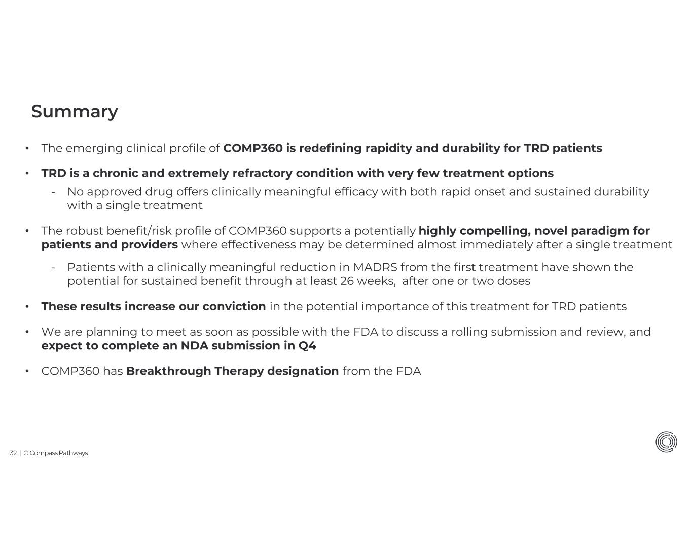 32 | © Compass Pathways Summary • The emerging clinical profile of COMP360 is redefining rapidity and durability for TRD patients • TRD is a chronic and extremely refractory condition with very few treatment options - No approved drug offers clinically meaningful efficacy with both rapid onset and sustained durability with a single treatment • The robust benefit/risk profile of COMP360 supports a potentially highly compelling, novel paradigm for patients and providers where effectiveness may be determined almost immediately after a single treatment - Patients with a clinically meaningful reduction in MADRS from the first treatment have shown the potential for sustained benefit through at least 26 weeks, after one or two doses • These results increase our conviction in the potential importance of this treatment for TRD patients • We are planning to meet as soon as possible with the FDA to discuss a rolling submission and review, and expect to complete an NDA submission in Q4 • COMP360 has Breakthrough Therapy designation from the FDA
