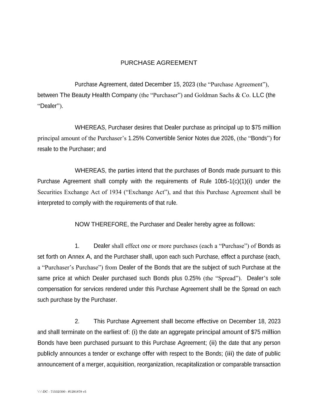 \\\DC - 71532/300 - #1291878 v5             PURCHASE AGREEMENT     Purchase Agreement, dated December 15, 2023 (the “Purchase Agreement”),  between The Beauty Health Company (the “Purchaser”) and Goldman Sachs & Co. LLC (the  “Dealer”).     WHEREAS, Purchaser desires that Dealer purchase as principal up to $75 million  principal amount of the Purchaser’s 1.25% Convertible Senior Notes due 2026, (the “Bonds”) for  resale to the Purchaser; and      WHEREAS, the parties intend that the purchases of Bonds made pursuant to this  Purchase Agreement shall comply with the requirements of Rule 10b5-1(c)(1)(i) under the  Securities Exchange Act of 1934 (“Exchange Act”), and that this Purchase Agreement shall be  interpreted to comply with the requirements of that rule.     NOW THEREFORE, the Purchaser and Dealer hereby agree as follows:     1. Dealer shall effect one or more purchases (each a “Purchase”) of Bonds as  set forth on Annex A, and the Purchaser shall, upon each such Purchase, effect a purchase (each,  a “Purchaser’s Purchase”) from Dealer of the Bonds that are the subject of such Purchase at the  same price at which Dealer purchased such Bonds plus 0.25% (the “Spread”).  Dealer’s sole  compensation for services rendered under this Purchase Agreement shall be the Spread on each  such purchase by the Purchaser.     2. This Purchase Agreement shall become effective on December 18, 2023  and shall terminate on the earliest of: (i) the date an aggregate principal amount of $75 million   Bonds have been purchased pursuant to this Purchase Agreement; (ii) the date that any person  publicly announces a tender or exchange offer with respect to the Bonds; (iii) the date of public  announcement of a merger, acquisition, reorganization, recapitalization or comparable transaction