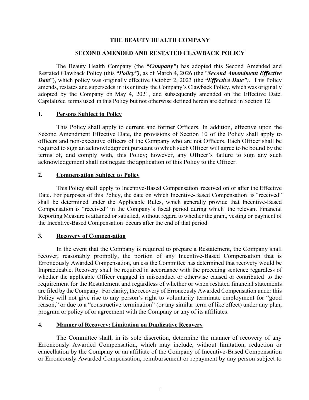 1 THE BEAUTY HEALTH COMPANY SECOND AMENDED AND RESTATED CLAWBACK POLICY The Beauty Health Company (the “Company”) has adopted this Second Amended and Restated Clawback Policy (this “Policy”), as of March 4, 2026 (the “Second Amendment Effective Date”), which policy was originally effective October 2, 2023 (the “Effective Date”). This Policy amends, restates and supersedes in its entirety the Company’s Clawback Policy, which was originally adopted by the Company on May 4, 2021, and subsequently amended on the Effective Date. Capitalized terms used in this Policy but not otherwise defined herein are defined in Section 12. 1. Persons Subject to Policy This Policy shall apply to current and former Officers. In addition, effective upon the Second Amendment Effective Date, the provisions of Section 10 of the Policy shall apply to officers and non-executive officers of the Company who are not Officers. Each Officer shall be required to sign an acknowledgment pursuant to which such Officer will agree to be bound by the terms of, and comply with, this Policy; however, any Officer’s failure to sign any such acknowledgement shall not negate the application of this Policy to the Officer. 2. Compensation Subject to Policy This Policy shall apply to Incentive-Based Compensation received on or after the Effective Date. For purposes of this Policy, the date on which Incentive-Based Compensation is “received” shall be determined under the Applicable Rules, which generally provide that Incentive-Based Compensation is “received” in the Company’s fiscal period during which the relevant Financial Reporting Measure is attained or satisfied, without regard to whether the grant, vesting or payment of the Incentive-Based Compensation occurs after the end of that period. 3. Recovery of Compensation In the event that the Company is required to prepare a Restatement, the Company shall recover, reasonably promptly, the portion of any Incentive-Based Compensation that is Erroneously Awarded Compensation, unless the Committee has determined that recovery would be Impracticable. Recovery shall be required in accordance with the preceding sentence regardless of whether the applicable Officer engaged in misconduct or otherwise caused or contributed to the requirement for the Restatement and regardless of whether or when restated financial statements are filed by the Company. For clarity, the recovery of Erroneously Awarded Compensation under this Policy will not give rise to any person’s right to voluntarily terminate employment for “good reason,” or due to a “constructive termination” (or any similar term of like effect) under any plan, program or policy of or agreement with the Company or any of its affiliates. 4. Manner of Recovery; Limitation on Duplicative Recovery The Committee shall, in its sole discretion, determine the manner of recovery of any Erroneously Awarded Compensation, which may include, without limitation, reduction or cancellation by the Company or an affiliate of the Company of Incentive-Based Compensation or Erroneously Awarded Compensation, reimbursement or repayment by any person subject to
