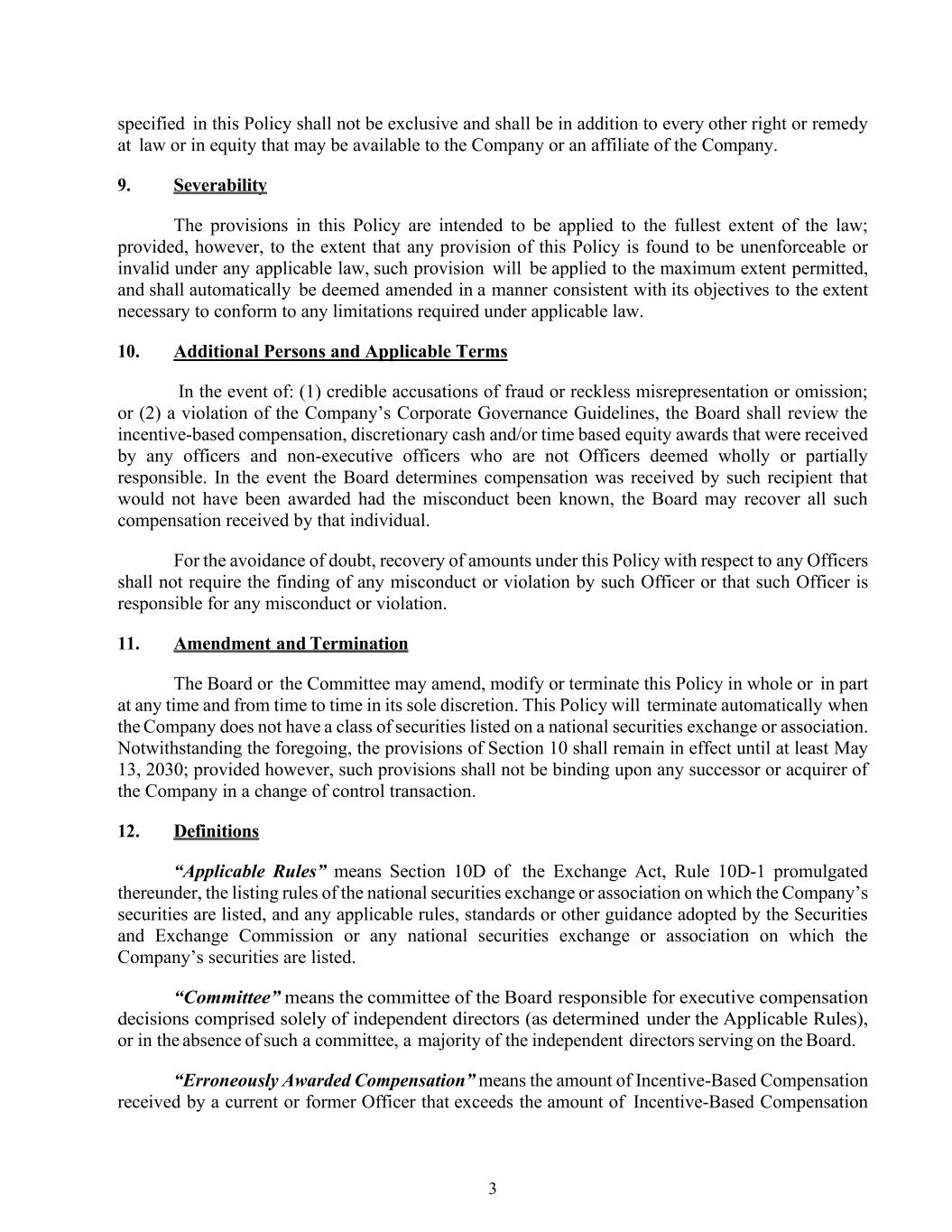 3 specified in this Policy shall not be exclusive and shall be in addition to every other right or remedy at law or in equity that may be available to the Company or an affiliate of the Company. 9. Severability The provisions in this Policy are intended to be applied to the fullest extent of the law; provided, however, to the extent that any provision of this Policy is found to be unenforceable or invalid under any applicable law, such provision will be applied to the maximum extent permitted, and shall automatically be deemed amended in a manner consistent with its objectives to the extent necessary to conform to any limitations required under applicable law. 10. Additional Persons and Applicable Terms In the event of: (1) credible accusations of fraud or reckless misrepresentation or omission; or (2) a violation of the Company’s Corporate Governance Guidelines, the Board shall review the incentive-based compensation, discretionary cash and/or time based equity awards that were received by any officers and non-executive officers who are not Officers deemed wholly or partially responsible. In the event the Board determines compensation was received by such recipient that would not have been awarded had the misconduct been known, the Board may recover all such compensation received by that individual. For the avoidance of doubt, recovery of amounts under this Policy with respect to any Officers shall not require the finding of any misconduct or violation by such Officer or that such Officer is responsible for any misconduct or violation. 11. Amendment and Termination The Board or the Committee may amend, modify or terminate this Policy in whole or in part at any time and from time to time in its sole discretion. This Policy will terminate automatically when the Company does not have a class of securities listed on a national securities exchange or association. Notwithstanding the foregoing, the provisions of Section 10 shall remain in effect until at least May 13, 2030; provided however, such provisions shall not be binding upon any successor or acquirer of the Company in a change of control transaction. 12. Definitions “Applicable Rules” means Section 10D of the Exchange Act, Rule 10D-1 promulgated thereunder, the listing rules of the national securities exchange or association on which the Company’s securities are listed, and any applicable rules, standards or other guidance adopted by the Securities and Exchange Commission or any national securities exchange or association on which the Company’s securities are listed. “Committee” means the committee of the Board responsible for executive compensation decisions comprised solely of independent directors (as determined under the Applicable Rules), or in the absence of such a committee, a majority of the independent directors serving on the Board. “Erroneously Awarded Compensation” means the amount of Incentive-Based Compensation received by a current or former Officer that exceeds the amount of Incentive-Based Compensation