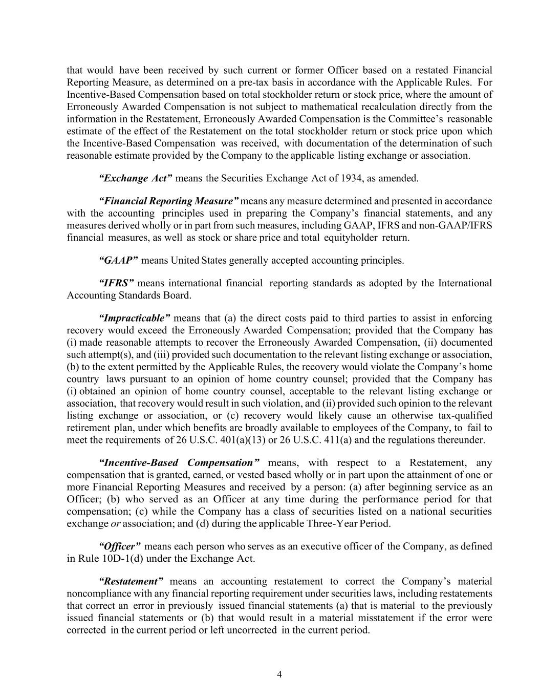 4 that would have been received by such current or former Officer based on a restated Financial Reporting Measure, as determined on a pre-tax basis in accordance with the Applicable Rules. For Incentive-Based Compensation based on total stockholder return or stock price, where the amount of Erroneously Awarded Compensation is not subject to mathematical recalculation directly from the information in the Restatement, Erroneously Awarded Compensation is the Committee’s reasonable estimate of the effect of the Restatement on the total stockholder return or stock price upon which the Incentive-Based Compensation was received, with documentation of the determination of such reasonable estimate provided by the Company to the applicable listing exchange or association. “Exchange Act” means the Securities Exchange Act of 1934, as amended. “Financial Reporting Measure” means any measure determined and presented in accordance with the accounting principles used in preparing the Company’s financial statements, and any measures derived wholly or in part from such measures, including GAAP, IFRS and non-GAAP/IFRS financial measures, as well as stock or share price and total equityholder return. “GAAP” means United States generally accepted accounting principles. “IFRS” means international financial reporting standards as adopted by the International Accounting Standards Board. “Impracticable” means that (a) the direct costs paid to third parties to assist in enforcing recovery would exceed the Erroneously Awarded Compensation; provided that the Company has (i) made reasonable attempts to recover the Erroneously Awarded Compensation, (ii) documented such attempt(s), and (iii) provided such documentation to the relevant listing exchange or association, (b) to the extent permitted by the Applicable Rules, the recovery would violate the Company’s home country laws pursuant to an opinion of home country counsel; provided that the Company has (i) obtained an opinion of home country counsel, acceptable to the relevant listing exchange or association, that recovery would result in such violation, and (ii) provided such opinion to the relevant listing exchange or association, or (c) recovery would likely cause an otherwise tax-qualified retirement plan, under which benefits are broadly available to employees of the Company, to fail to meet the requirements of 26 U.S.C. 401(a)(13) or 26 U.S.C. 411(a) and the regulations thereunder. “Incentive-Based Compensation” means, with respect to a Restatement, any compensation that is granted, earned, or vested based wholly or in part upon the attainment of one or more Financial Reporting Measures and received by a person: (a) after beginning service as an Officer; (b) who served as an Officer at any time during the performance period for that compensation; (c) while the Company has a class of securities listed on a national securities exchange or association; and (d) during the applicable Three-Year Period. “Officer” means each person who serves as an executive officer of the Company, as defined in Rule 10D-1(d) under the Exchange Act. “Restatement” means an accounting restatement to correct the Company’s material noncompliance with any financial reporting requirement under securities laws, including restatements that correct an error in previously issued financial statements (a) that is material to the previously issued financial statements or (b) that would result in a material misstatement if the error were corrected in the current period or left uncorrected in the current period.