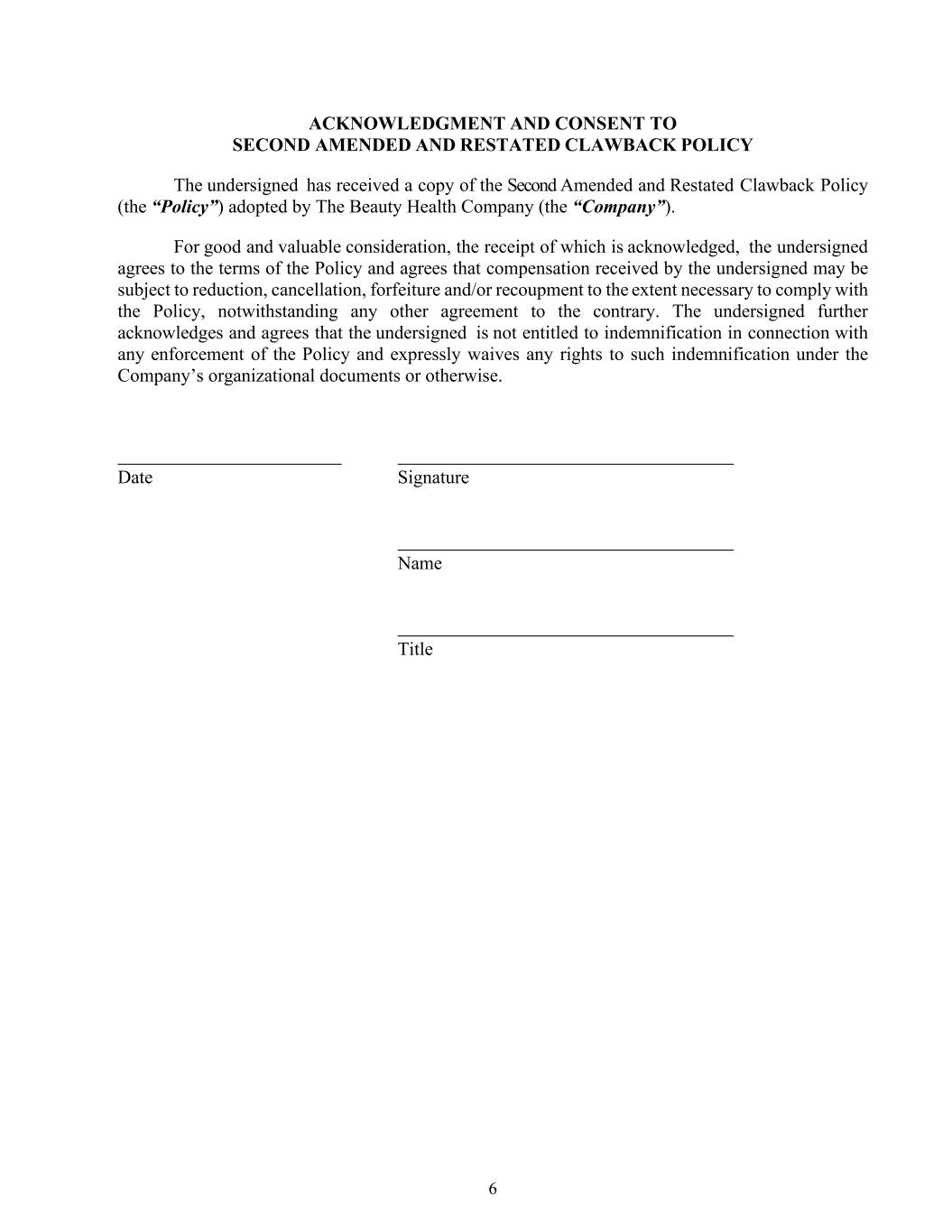6 ACKNOWLEDGMENT AND CONSENT TO SECOND AMENDED AND RESTATED CLAWBACK POLICY The undersigned has received a copy of the Second Amended and Restated Clawback Policy (the “Policy”) adopted by The Beauty Health Company (the “Company”). For good and valuable consideration, the receipt of which is acknowledged, the undersigned agrees to the terms of the Policy and agrees that compensation received by the undersigned may be subject to reduction, cancellation, forfeiture and/or recoupment to the extent necessary to comply with the Policy, notwithstanding any other agreement to the contrary. The undersigned further acknowledges and agrees that the undersigned is not entitled to indemnification in connection with any enforcement of the Policy and expressly waives any rights to such indemnification under the Company’s organizational documents or otherwise. Date Signature Name Title