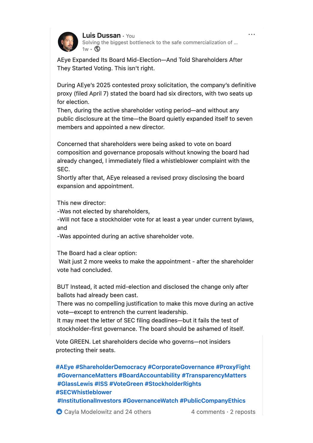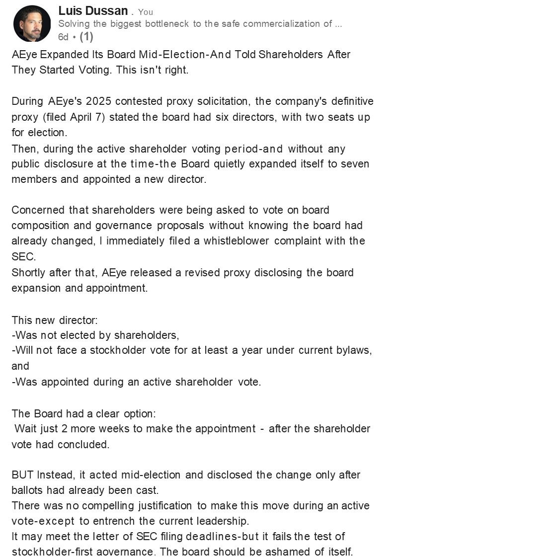 Luis Dussan . You Solving the biggest bottleneck to the safe commercialization of ... 6d • (1) AEye Expanded Its Board Mid - Election - And Told Shareholders After They Started Voting. This isn't right. During AEye's 2025 contested proxy solicitation, the company's definitive proxy (filed April 7) stated the board had six directors, with two seats up for election. Then, during the active shareholder voting period - and without any public disclosure at the time - the Board quietly expanded itself to seven members and appointed a new director. Concerned that shareholders were being asked to vote on board composition and governance proposals without knowing the board had already changed, I immediately filed a whistleblower complaint with the SEC. Shortly after that, AEye released a revised proxy disclosing the board expansion and appointment. This new director: - Was not elected by shareholders, - Will not face a stockholder vote for at least a year under current bylaws, and - Was appointed during an active shareholder vote. The Board had a clear option: Wait just 2 more weeks to make the appointment - after the shareholder vote had concluded. BUT Instead, it acted mid - election and disclosed the change only after ballots had already been cast. There was no compelling justification to make this move during an active vote - except to entrench the current leadership. It may meet the letter of SEC filing deadlines - but it fails the test of stockholder - first aovernance . The board should be ashamed of itself.