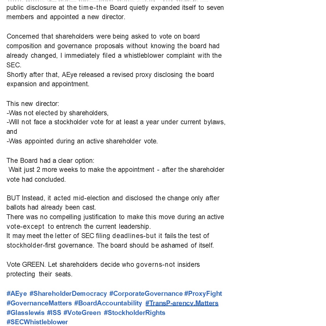 111v11, uu1111::, \ .II \ ,,,,,, UV \ .IY \ ,,,,,, VIIUl \ ,,,,,,IIVIUVI VV \ .111:::, , - ..,v,1vu UIIU VYI \ .IIV \ ..41 \ . ......, public disclosure at the time - the Board quietly expanded itself to seven members and appointed a new director. Concerned that shareholders were being asked to vote on board composition and governance proposals without knowing the board had already changed, I immediately filed a whistleblower complaint with the SEC. Shortly after that, AEye released a revised proxy disclosing the board expansion and appointment. This new director: - Was not elected by shareholders, - Will not face a stockholder vote for at least a year under current bylaws, and - Was appointed during an active shareholder vote. The Board had a clear option: Wait just 2 more weeks to make the appointment - after the shareholder vote had concluded. BUT Instead, it acted mid - election and disclosed the change only after ballots had already been cast. There was no compelling justification to make this move during an active vote - except to entrench the current leadership. It may meet the letter of SEC filing deadlines - but it fails the test of stockholder - first governance. The board should be ashamed of itself. Vote GREEN. Let shareholders decide who governs - not insiders protecting their seats. #AEye #ShareholderDemocracy #CorporateGovernance #ProxyFight #GovernanceMatters #BoardAccountability #TransP - arencv.Matters #Glasslewis #ISS #VoteGreen #StockholderRights #SECWhistleblower
