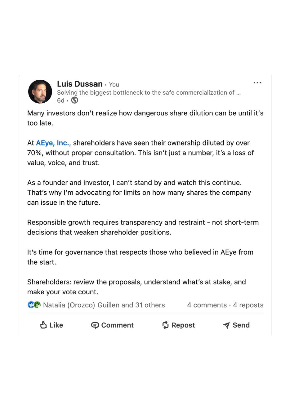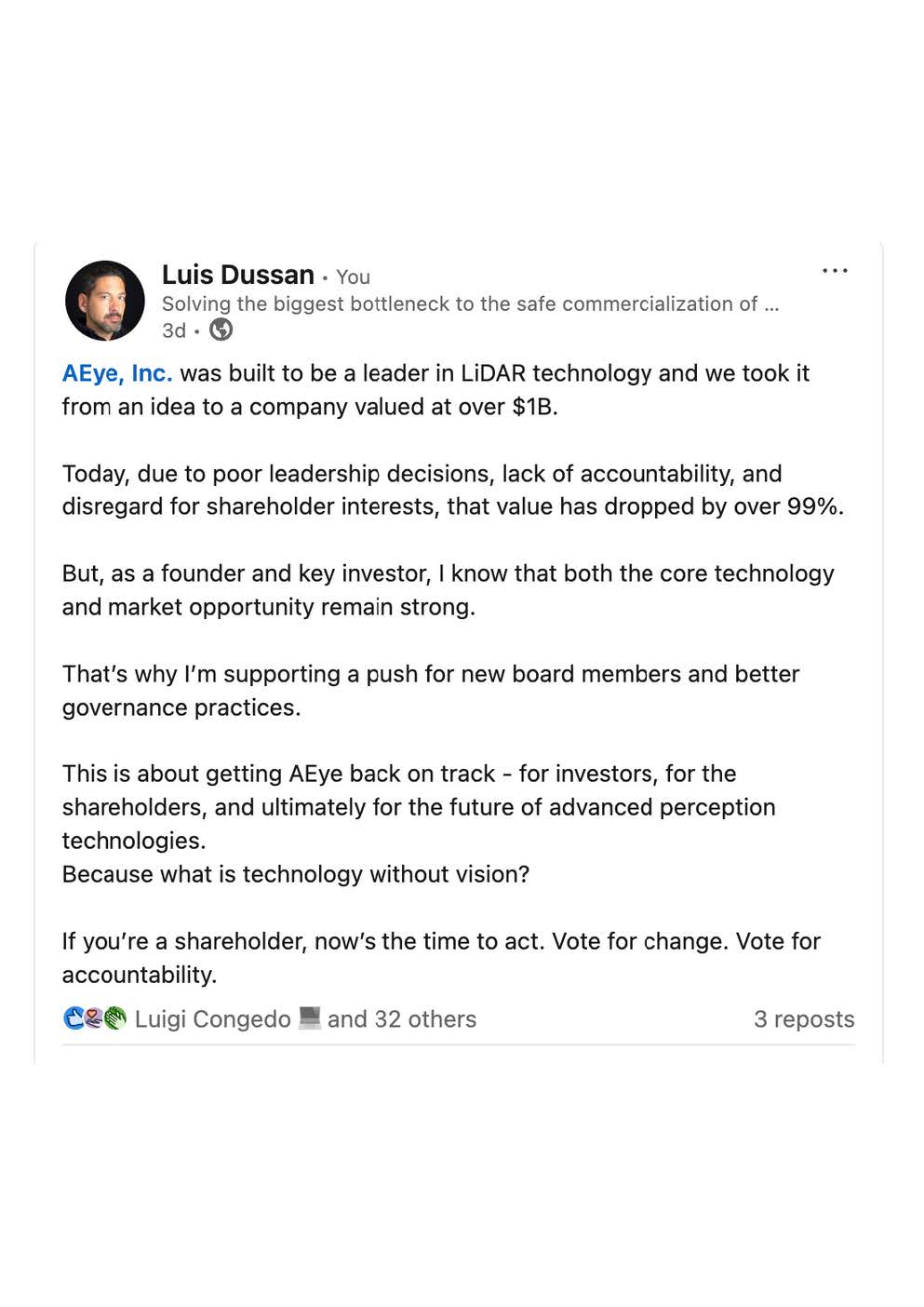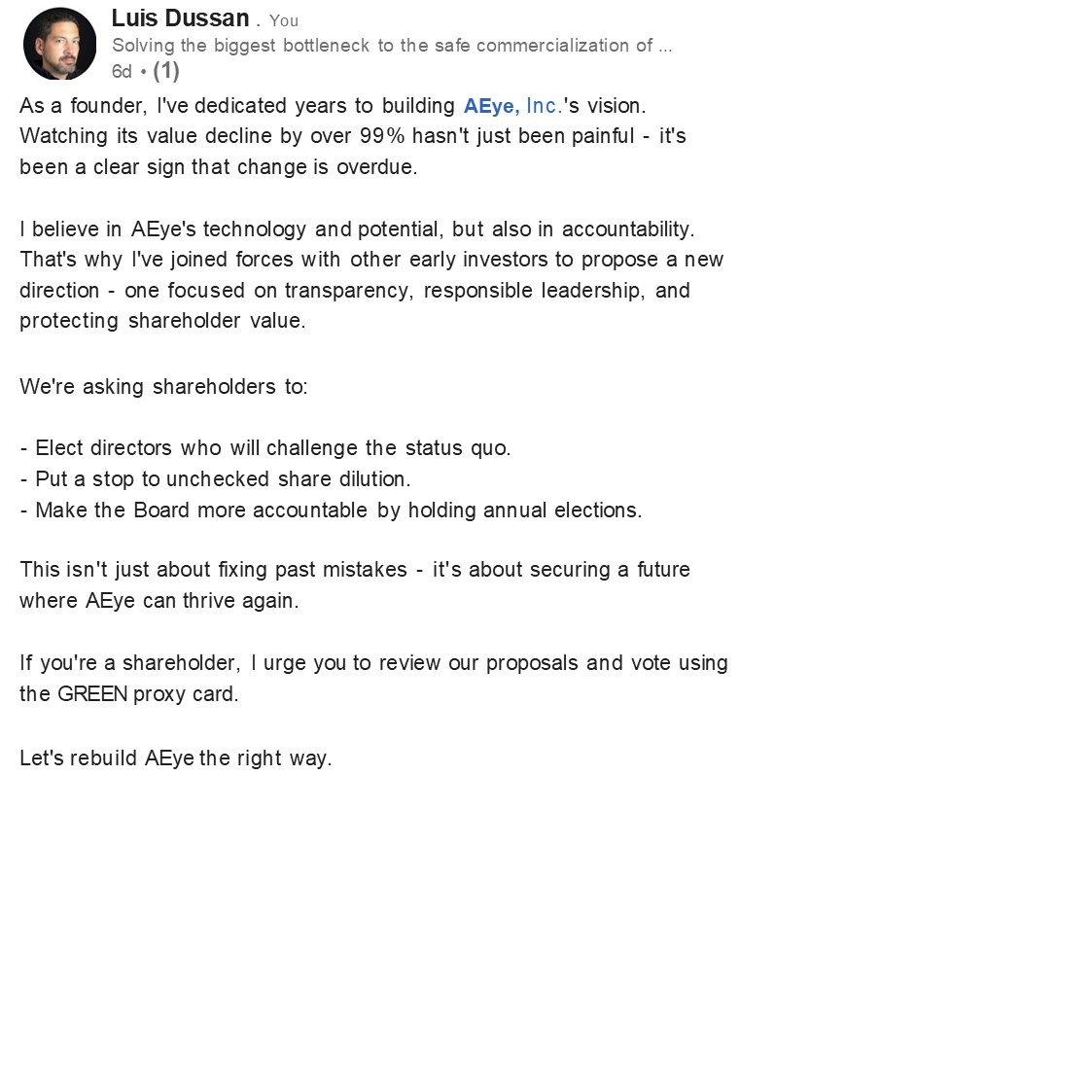Luis Dussan . You Solving the biggest bottleneck to the safe commercialization of ... 6d • (1) As a founder, I've dedicated years to building AEye, lnc. 's vision. Watching its value decline by over 99% hasn't just been painful - it's been a clear sign that change is overdue. I believe in AEye's technology and potential, but also in accountability. That's why I've joined forces with other early investors to propose a new direction - one focused on transparency, responsible leadership, and protecting shareholder value. We're asking shareholders to: - Elect directors who will challenge the status quo. - Put a stop to unchecked share dilution. - Make the Board more accountable by holding annual elections. This isn't just about fixing past mistakes - it's about securing a future where AEye can thrive again. If you're a shareholder, I urge you to review our proposals and vote using the GREEN proxy card. Let's rebuild AEye the right way.