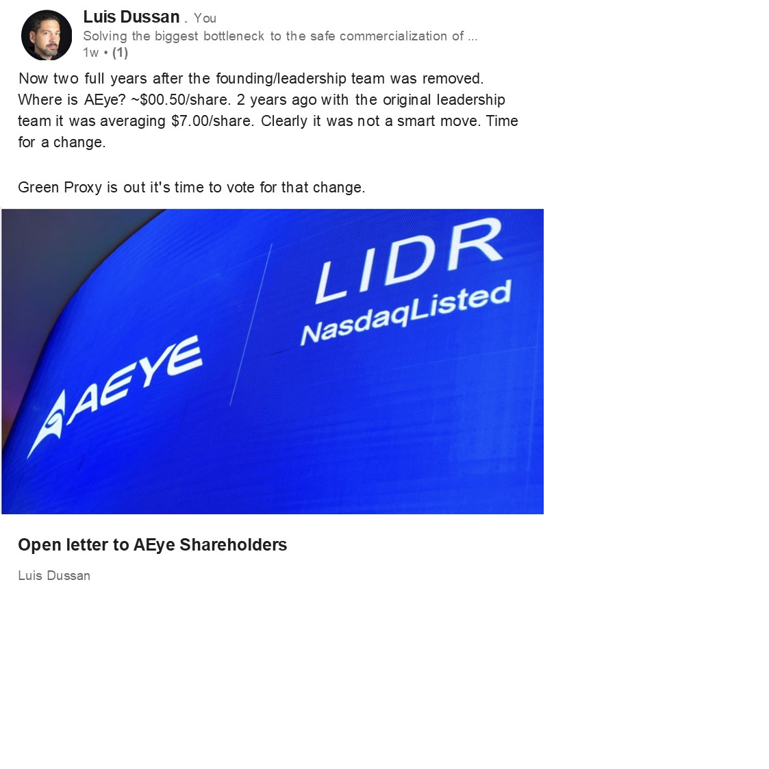 Luis Dussan . You Solving the biggest bottleneck to the safe commercialization of ... 1w • (1) Now two full years after the founding/leadership team was removed. Where is AEye? ~$00.50/share. 2 years ago with the original leadership team it was averaging $7.00/share. Clearly it was not a smart move. Time for a change. Green Proxy is out it's time to vote for that change. Open letter to AEye Shareholders Luis Dussan
