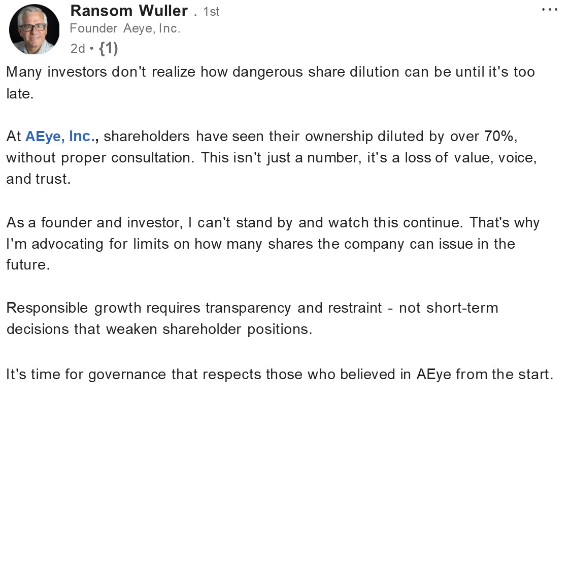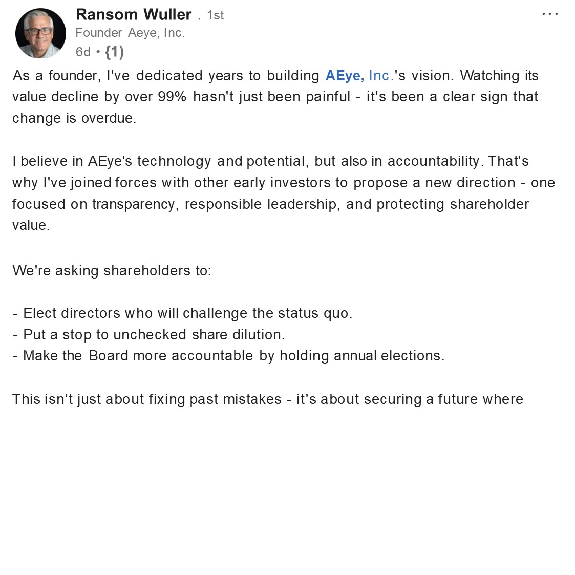 Ransom Wuller . 1st Founder Aeye, Inc. 6d • {1) As a founder, I've dedicated years to building AEye, lnc . 's vision . Watching its value decline by over 99 % hasn't just been painful - it's been a clear sign that change is overdue . I believe in AEye's technology and potential, but also in accountability. That's why I've joined forces with other early investors to propose a new direction - one focused on transparency, responsible leadership, and protecting shareholder value. We're asking shareholders to: - Elect directors who will challenge the status quo. - Put a stop to unchecked share dilution. - Make the Board more accountable by holding annual elections. This isn't just about fixing past mistakes - it's about securing a future where • • •