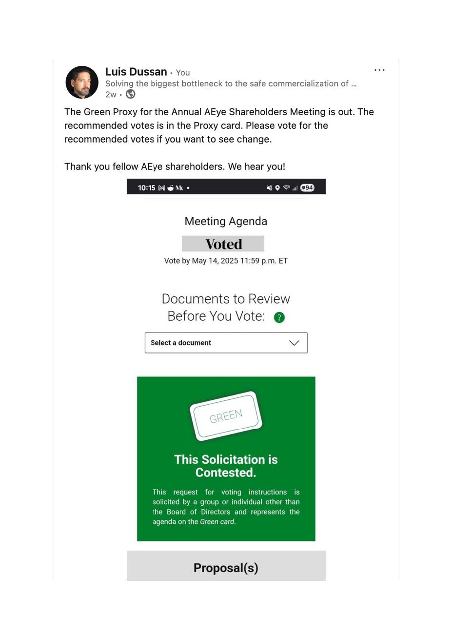 LUIS uussan . You Solving the biggest bottleneck to the safe commercialization of ... 1w • (1) The Green Proxy for the Annual AEye Shareholders Meeting is out. The recommended votes is in the Proxy card. Please vote for the recommended votes if you want to see change. Thank you fellow AEye shareholders. We hear you! Meeting Agenda Voted Vote by May 14, 2025 11:59 p . m . ET Documents to Review Before You Vote: O I Select a document V - - I � - '