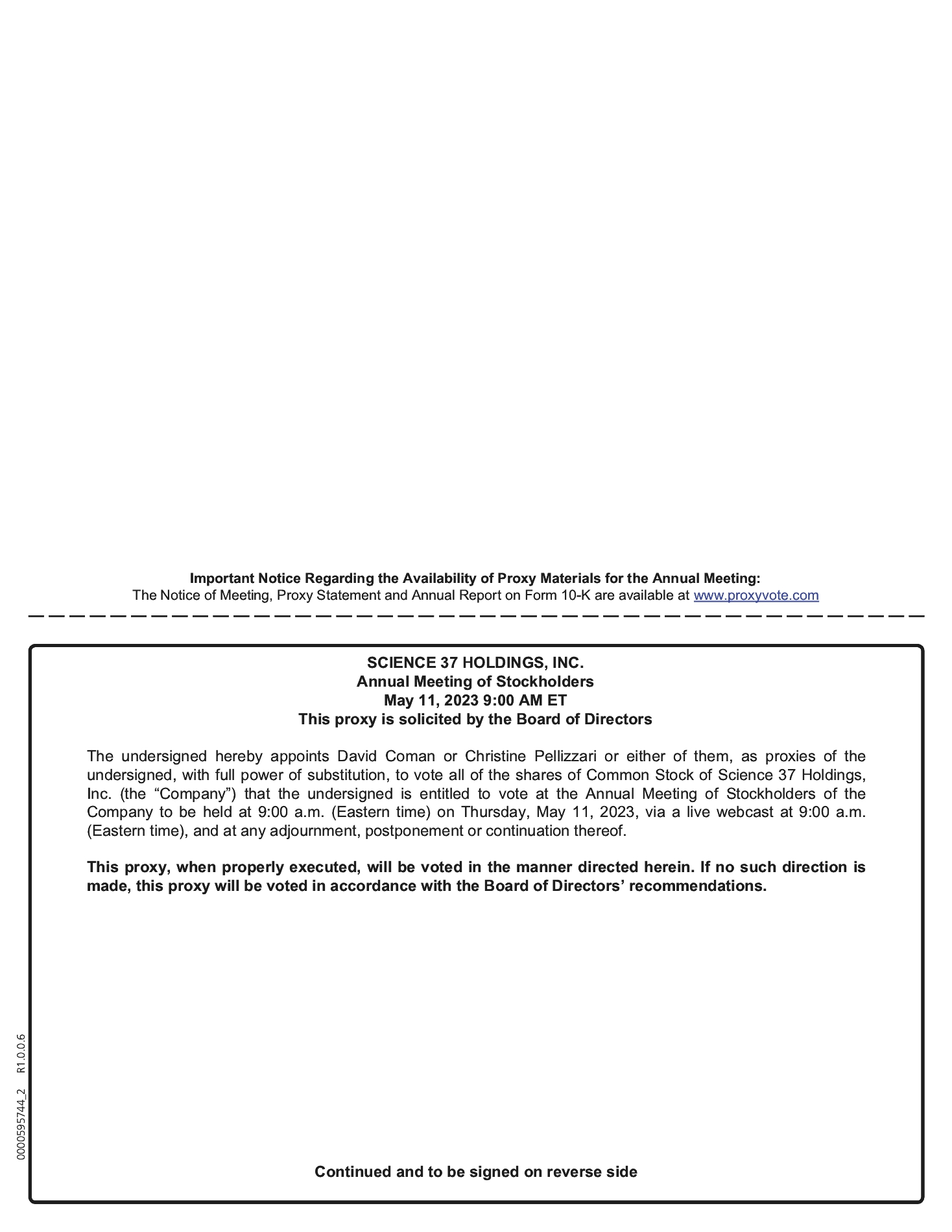 Director Nomination Agreement. LSAQ, the Sponsor, Legacy Science 37 and certain stockholders of Legacy Science 37 entered into a Director Nomination Agreement, dated October 6, 2021, pursuant to which each party agreed that our board of directors would initially upon the effectiveness of the Business Combination consist of at least seven members, one of which will be appointed by LSAQ pursuant to the Merger Agreement, and the remainder of which would be appointed by Legacy Science 37. Pursuant to the Director Nomination Agreement, our board is currently comprised of the following: David Coman, our Chief Executive Officer; one independent director designated by certain affiliates of Redmile Group, LLC, who is Robert Faulkner; one independent director to be designated by Pharmaceutical Product Development, LLC, who is Bhooshitha B. De Silva; and four additional independent directors, who are John W. Hubbard, Neil Tiwari, Emily Rollins and Paul von Autenried. Lux Capital Management, LLC previously appointed Adam Goulburn to the Board of Directors, who resigned from the Board effective September 30, 2022. The Director Nomination Agreement provides, among other things, that from and after the closing of the Business Combination and until such time as a stockholder (together with its affiliates) beneficially owns less than 10.0% of our then-issued and outstanding shares of common stock, each of the applicable LSAQ stockholders will be entitled to nominate one person for election as a director of our Board at the applicable meeting of our stockholders, and subject to our Board's fiduciary duties, our Board will recommend these directors for stockholder approval. Additionally, under the agreement, in the event of the first vacancy that occurs on our Board, LifeSci Holdings, LLC shall be entitled to designate an independent director to fill such vacancy so long as it and its affiliates beneficially owns more than 1.0% of our then-issued and outstanding shares of common stock.