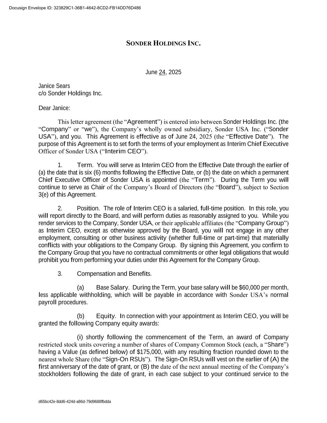 d65bc42e-8dd6-424d-a86d-79d9688fbdda SONDER HOLDINGS INC. June 24, 2025 Janice Sears c/o Sonder Holdings Inc. Dear Janice: This letter agreement (the “Agreement”) is entered into between Sonder Holdings Inc. (the “Company” or “we”), the Company’s wholly owned subsidiary, Sonder USA Inc. (“Sonder USA”), and you. This Agreement is effective as of June 24, 2025 (the “Effective Date”). The purpose of this Agreement is to set forth the terms of your employment as Interim Chief Executive Officer of Sonder USA (“Interim CEO”). 1. Term. You will serve as Interim CEO from the Effective Date through the earlier of (a) the date that is six (6) months following the Effective Date, or (b) the date on which a permanent Chief Executive Officer of Sonder USA is appointed (the “Term”). During the Term you will continue to serve as Chair of the Company’s Board of Directors (the “Board”), subject to Section 3(e) of this Agreement. 2. Position. The role of Interim CEO is a salaried, full-time position. In this role, you will report directly to the Board, and will perform duties as reasonably assigned to you. While you render services to the Company, Sonder USA, or their applicable affiliates (the “Company Group”) as Interim CEO, except as otherwise approved by the Board, you will not engage in any other employment, consulting or other business activity (whether full-time or part-time) that materially conflicts with your obligations to the Company Group. By signing this Agreement, you confirm to the Company Group that you have no contractual commitments or other legal obligations that would prohibit you from performing your duties under this Agreement for the Company Group. 3. Compensation and Benefits. (a) Base Salary. During the Term, your base salary will be $60,000 per month, less applicable withholding, which will be payable in accordance with Sonder USA’s normal payroll procedures. (b) Equity. In connection with your appointment as Interim CEO, you will be granted the following Company equity awards: (i) shortly following the commencement of the Term, an award of Company restricted stock units covering a number of shares of Company Common Stock (each, a “Share”) having a Value (as defined below) of $175,000, with any resulting fraction rounded down to the nearest whole Share (the “Sign-On RSUs”). The Sign-On RSUs will vest on the earlier of (A) the first anniversary of the date of grant, or (B) the date of the next annual meeting of the Company’s stockholders following the date of grant, in each case subject to your continued service to the Docusign Envelope ID: 323829C1-36B1-4642-8CD2-FB14DD76D486