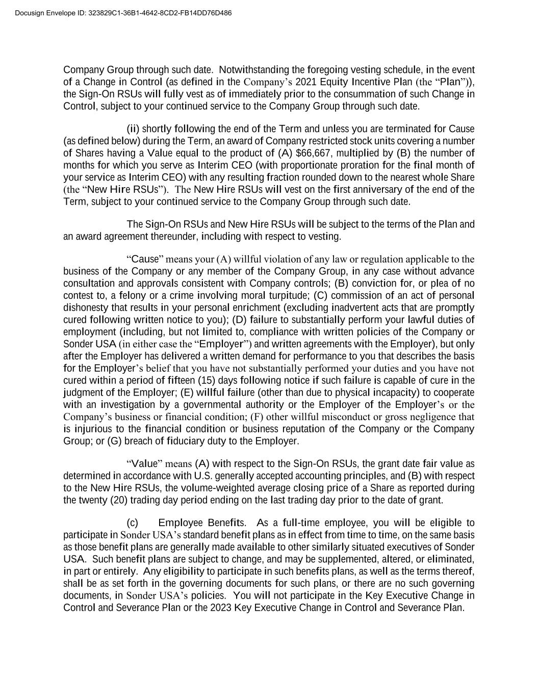 Company Group through such date. Notwithstanding the foregoing vesting schedule, in the event of a Change in Control (as defined in the Company’s 2021 Equity Incentive Plan (the “Plan”)), the Sign-On RSUs will fully vest as of immediately prior to the consummation of such Change in Control, subject to your continued service to the Company Group through such date. (ii) shortly following the end of the Term and unless you are terminated for Cause (as defined below) during the Term, an award of Company restricted stock units covering a number of Shares having a Value equal to the product of (A) $66,667, multiplied by (B) the number of months for which you serve as Interim CEO (with proportionate proration for the final month of your service as Interim CEO) with any resulting fraction rounded down to the nearest whole Share (the “New Hire RSUs”). The New Hire RSUs will vest on the first anniversary of the end of the Term, subject to your continued service to the Company Group through such date. The Sign-On RSUs and New Hire RSUs will be subject to the terms of the Plan and an award agreement thereunder, including with respect to vesting. “Cause” means your (A) willful violation of any law or regulation applicable to the business of the Company or any member of the Company Group, in any case without advance consultation and approvals consistent with Company controls; (B) conviction for, or plea of no contest to, a felony or a crime involving moral turpitude; (C) commission of an act of personal dishonesty that results in your personal enrichment (excluding inadvertent acts that are promptly cured following written notice to you); (D) failure to substantially perform your lawful duties of employment (including, but not limited to, compliance with written policies of the Company or Sonder USA (in either case the “Employer”) and written agreements with the Employer), but only after the Employer has delivered a written demand for performance to you that describes the basis for the Employer’s belief that you have not substantially performed your duties and you have not cured within a period of fifteen (15) days following notice if such failure is capable of cure in the judgment of the Employer; (E) willful failure (other than due to physical incapacity) to cooperate with an investigation by a governmental authority or the Employer of the Employer’s or the Company’s business or financial condition; (F) other willful misconduct or gross negligence that is injurious to the financial condition or business reputation of the Company or the Company Group; or (G) breach of fiduciary duty to the Employer. “Value” means (A) with respect to the Sign-On RSUs, the grant date fair value as determined in accordance with U.S. generally accepted accounting principles, and (B) with respect to the New Hire RSUs, the volume-weighted average closing price of a Share as reported during the twenty (20) trading day period ending on the last trading day prior to the date of grant. (c) Employee Benefits. As a full-time employee, you will be eligible to participate in Sonder USA’s standard benefit plans as in effect from time to time, on the same basis as those benefit plans are generally made available to other similarly situated executives of Sonder USA. Such benefit plans are subject to change, and may be supplemented, altered, or eliminated, in part or entirely. Any eligibility to participate in such benefits plans, as well as the terms thereof, shall be as set forth in the governing documents for such plans, or there are no such governing documents, in Sonder USA’s policies. You will not participate in the Key Executive Change in Control and Severance Plan or the 2023 Key Executive Change in Control and Severance Plan. Docusign Envelope ID: 323829C1-36B1-4642-8CD2-FB14DD76D486