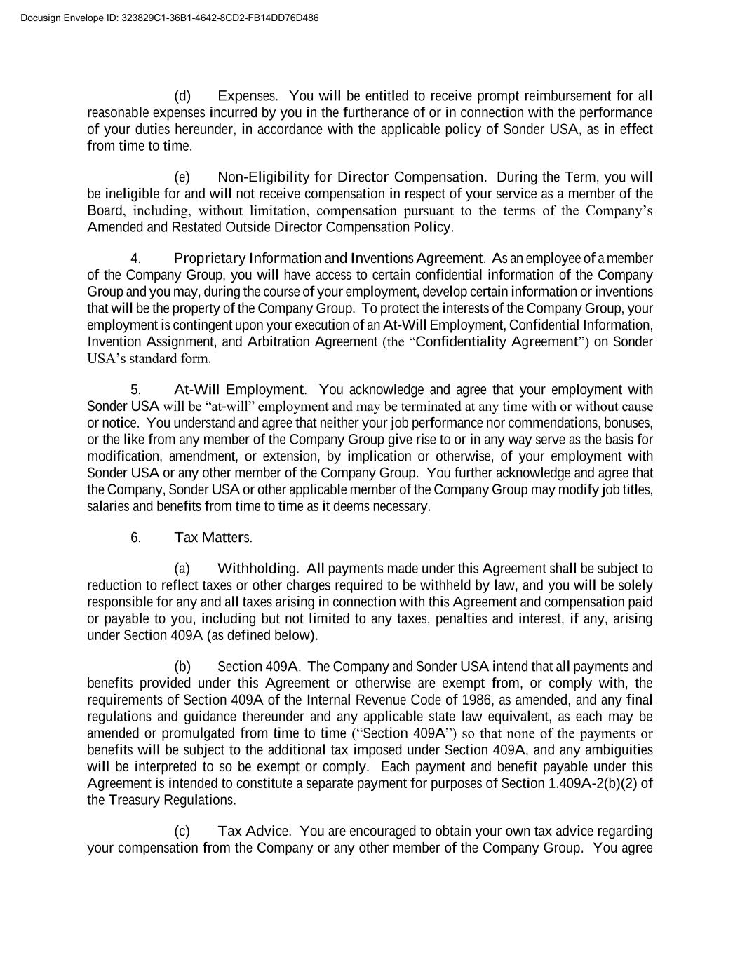 (d) Expenses. You will be entitled to receive prompt reimbursement for all reasonable expenses incurred by you in the furtherance of or in connection with the performance of your duties hereunder, in accordance with the applicable policy of Sonder USA, as in effect from time to time. (e) Non-Eligibility for Director Compensation. During the Term, you will be ineligible for and will not receive compensation in respect of your service as a member of the Board, including, without limitation, compensation pursuant to the terms of the Company’s Amended and Restated Outside Director Compensation Policy. 4. Proprietary Information and Inventions Agreement. As an employee of a member of the Company Group, you will have access to certain confidential information of the Company Group and you may, during the course of your employment, develop certain information or inventions that will be the property of the Company Group. To protect the interests of the Company Group, your employment is contingent upon your execution of an At-Will Employment, Confidential Information, Invention Assignment, and Arbitration Agreement (the “Confidentiality Agreement”) on Sonder USA’s standard form. 5. At-Will Employment. You acknowledge and agree that your employment with Sonder USA will be “at-will” employment and may be terminated at any time with or without cause or notice. You understand and agree that neither your job performance nor commendations, bonuses, or the like from any member of the Company Group give rise to or in any way serve as the basis for modification, amendment, or extension, by implication or otherwise, of your employment with Sonder USA or any other member of the Company Group. You further acknowledge and agree that the Company, Sonder USA or other applicable member of the Company Group may modify job titles, salaries and benefits from time to time as it deems necessary. 6. Tax Matters. (a) Withholding. All payments made under this Agreement shall be subject to reduction to reflect taxes or other charges required to be withheld by law, and you will be solely responsible for any and all taxes arising in connection with this Agreement and compensation paid or payable to you, including but not limited to any taxes, penalties and interest, if any, arising under Section 409A (as defined below). (b) Section 409A. The Company and Sonder USA intend that all payments and benefits provided under this Agreement or otherwise are exempt from, or comply with, the requirements of Section 409A of the Internal Revenue Code of 1986, as amended, and any final regulations and guidance thereunder and any applicable state law equivalent, as each may be amended or promulgated from time to time (“Section 409A”) so that none of the payments or benefits will be subject to the additional tax imposed under Section 409A, and any ambiguities will be interpreted to so be exempt or comply. Each payment and benefit payable under this Agreement is intended to constitute a separate payment for purposes of Section 1.409A-2(b)(2) of the Treasury Regulations. (c) Tax Advice. You are encouraged to obtain your own tax advice regarding your compensation from the Company or any other member of the Company Group. You agree Docusign Envelope ID: 323829C1-36B1-4642-8CD2-FB14DD76D486