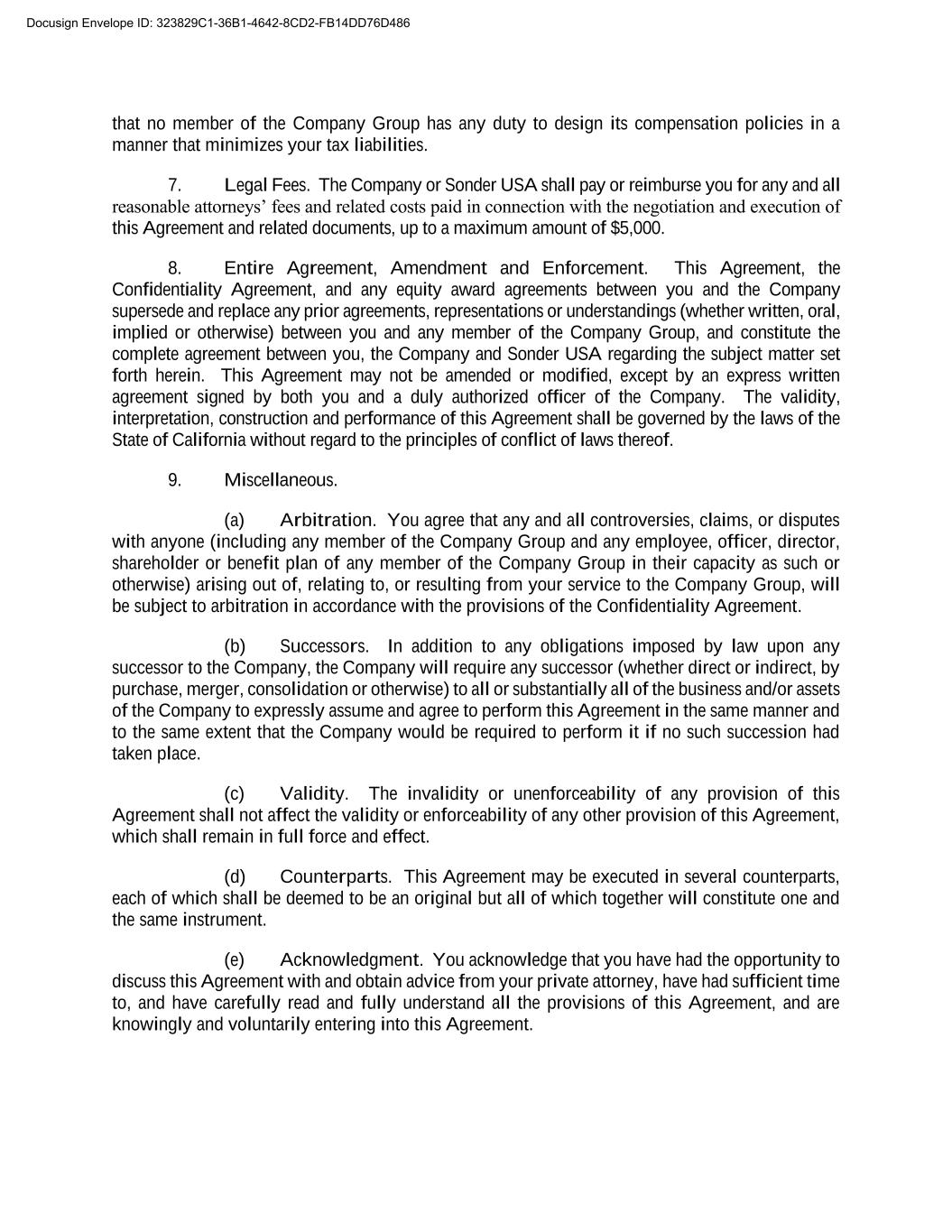that no member of the Company Group has any duty to design its compensation policies in a manner that minimizes your tax liabilities. 7. Legal Fees. The Company or Sonder USA shall pay or reimburse you for any and all reasonable attorneys’ fees and related costs paid in connection with the negotiation and execution of this Agreement and related documents, up to a maximum amount of $5,000. 8. Entire Agreement, Amendment and Enforcement. This Agreement, the Confidentiality Agreement, and any equity award agreements between you and the Company supersede and replace any prior agreements, representations or understandings (whether written, oral, implied or otherwise) between you and any member of the Company Group, and constitute the complete agreement between you, the Company and Sonder USA regarding the subject matter set forth herein. This Agreement may not be amended or modified, except by an express written agreement signed by both you and a duly authorized officer of the Company. The validity, interpretation, construction and performance of this Agreement shall be governed by the laws of the State of California without regard to the principles of conflict of laws thereof. 9. Miscellaneous. (a) Arbitration. You agree that any and all controversies, claims, or disputes with anyone (including any member of the Company Group and any employee, officer, director, shareholder or benefit plan of any member of the Company Group in their capacity as such or otherwise) arising out of, relating to, or resulting from your service to the Company Group, will be subject to arbitration in accordance with the provisions of the Confidentiality Agreement. (b) Successors. In addition to any obligations imposed by law upon any successor to the Company, the Company will require any successor (whether direct or indirect, by purchase, merger, consolidation or otherwise) to all or substantially all of the business and/or assets of the Company to expressly assume and agree to perform this Agreement in the same manner and to the same extent that the Company would be required to perform it if no such succession had taken place. (c) Validity. The invalidity or unenforceability of any provision of this Agreement shall not affect the validity or enforceability of any other provision of this Agreement, which shall remain in full force and effect. (d) Counterparts. This Agreement may be executed in several counterparts, each of which shall be deemed to be an original but all of which together will constitute one and the same instrument. (e) Acknowledgment. You acknowledge that you have had the opportunity to discuss this Agreement with and obtain advice from your private attorney, have had sufficient time to, and have carefully read and fully understand all the provisions of this Agreement, and are knowingly and voluntarily entering into this Agreement. Docusign Envelope ID: 323829C1-36B1-4642-8CD2-FB14DD76D486