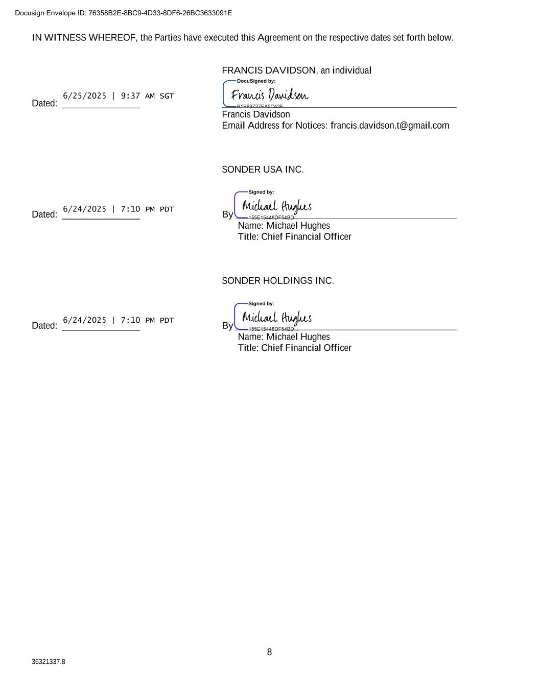 8 36321337.8 IN WITNESS WHEREOF, the Parties have executed this Agreement on the respective dates set forth below. FRANCIS DAVIDSON, an individual Dated: ________________ Francis Davidson Email Address for Notices: francis.davidson.t@gmail.com SONDER USA INC. Dated: ________________ By Name: Michael Hughes Title: Chief Financial Officer SONDER HOLDINGS INC. Dated: ________________ By Name: Michael Hughes Title: Chief Financial Officer Docusign Envelope ID: 76358B2E-8BC9-4D33-8DF6-26BC3633091E 6/25/2025 | 9:37 AM SGT 6/24/2025 | 7:10 PM PDT 6/24/2025 | 7:10 PM PDT