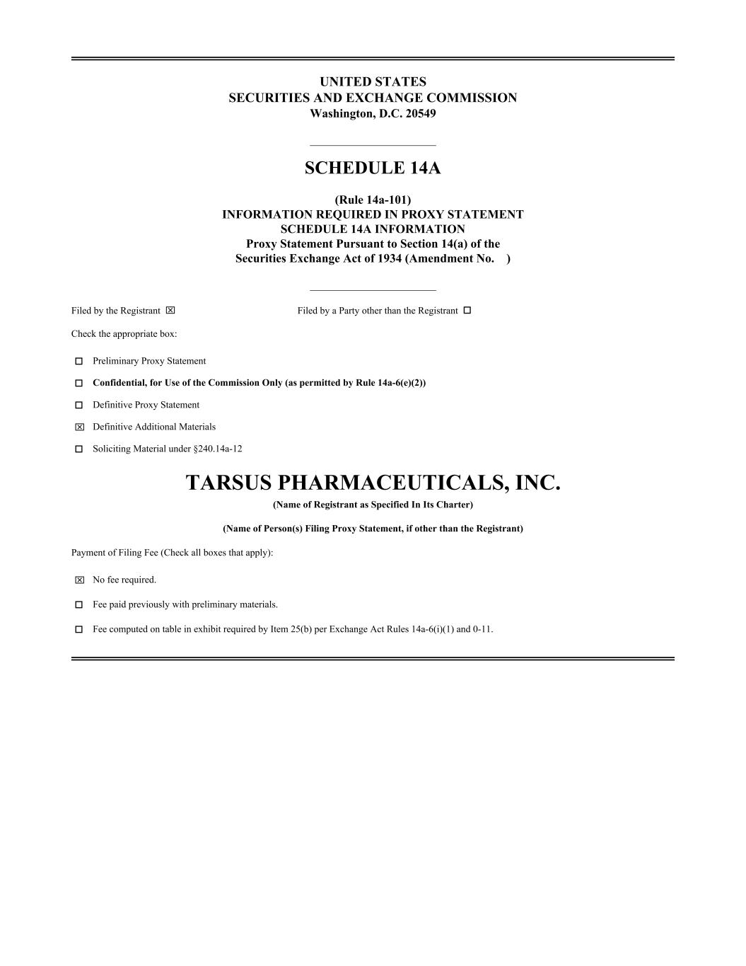 UNITED STATES SECURITIES AND EXCHANGE COMMISSION Washington, D.C. 20549 _______________________ SCHEDULE 14A (Rule 14a-101) INFORMATION REQUIRED IN PROXY STATEMENT SCHEDULE 14A INFORMATION Proxy Statement Pursuant to Section 14(a) of the Securities Exchange Act of 1934 (Amendment No. ) _______________________ Filed by the Registrant x Filed by a Party other than the Registrant o Check the appropriate box: o Preliminary Proxy Statement o Confidential, for Use of the Commission Only (as permitted by Rule 14a-6(e)(2)) o Definitive Proxy Statement x Definitive Additional Materials o Soliciting Material under §240.14a-12 TARSUS PHARMACEUTICALS, INC. (Name of Registrant as Specified In Its Charter) (Name of Person(s) Filing Proxy Statement, if other than the Registrant) Payment of Filing Fee (Check all boxes that apply): x No fee required. o Fee paid previously with preliminary materials. o Fee computed on table in exhibit required by Item 25(b) per Exchange Act Rules 14a-6(i)(1) and 0-11.