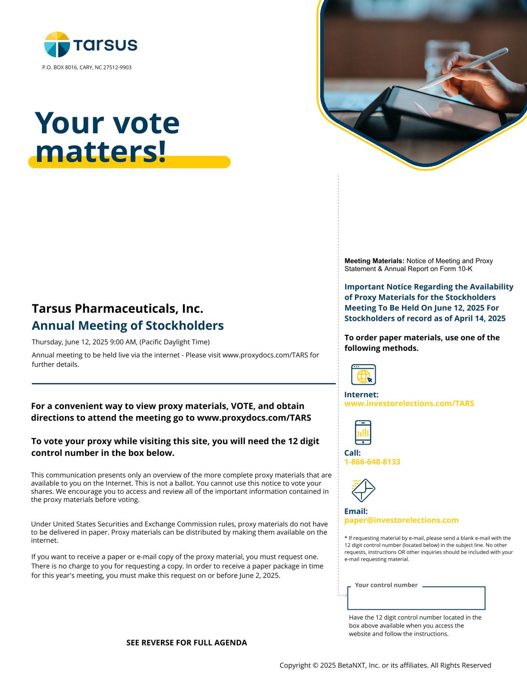 Your control number Your vote matters! Meeting Materials: Notice of Meeting and Proxy Statement & Annual Report on Form 10-K Important Notice Regarding the Availability of Proxy Materials for the Stockholders Meeting To Be Held On June 12, 2025 For Stockholders of record as of April 14, 2025 To order paper materials, use one of the following methods. Internet: www.investorelections.com/TARS Call: 1-866-648-8133 Email: paper@investorelections.com * If requesting material by e-mail, please send a blank e-mail with the 12 digit control number (located below) in the subject line. No other requests, instructions OR other inquiries should be included with your e-mail requesting material. Have the 12 digit control number located in the box above available when you access the website and follow the instructions. Copyright © 2025 BetaNXT, Inc. or its affiliates. All Rights Reserved Tarsus Pharmaceuticals, Inc. Annual Meeting of Stockholders Thursday, June 12, 2025 9:00 AM, (Pacific Daylight Time) Annual meeting to be held live via the internet - Please visit www.proxydocs.com/TARS for further details. For a convenient way to view proxy materials, VOTE, and obtain directions to attend the meeting go to www.proxydocs.com/TARS To vote your proxy while visiting this site, you will need the 12 digit control number in the box below. This communication presents only an overview of the more complete proxy materials that are available to you on the Internet. This is not a ballot. You cannot use this notice to vote your shares. We encourage you to access and review all of the important information contained in the proxy materials before voting. Under United States Securities and Exchange Commission rules, proxy materials do not have to be delivered in paper. Proxy materials can be distributed by making them available on the internet. If you want to receive a paper or e-mail copy of the proxy material, you must request one. There is no charge to you for requesting a copy. In order to receive a paper package in time for this year's meeting, you must make this request on or before June 2, 2025. styleINA P.O. BOX 8016, CARY, NC 27512-9903 SEE REVERSE FOR FULL AGENDA