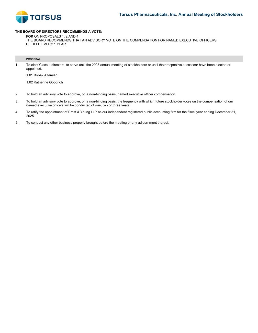 PROPOSAL 1. To elect Class II directors, to serve until the 2028 annual meeting of stockholders or until their respective successor have been elected or appointed. 1.01 Bobak Azamian 1.02 Katherine Goodrich 2. To hold an advisory vote to approve, on a non-binding basis, named executive officer compensation. 3. To hold an advisory vote to approve, on a non-binding basis, the frequency with which future stockholder votes on the compensation of our named executive officers will be conducted of one, two or three years. 4. To ratify the appointment of Ernst & Young LLP as our independent registered public accounting firm for the fiscal year ending December 31, 2025. 5. To conduct any other business properly brought before the meeting or any adjournment thereof. THE BOARD OF DIRECTORS RECOMMENDS A VOTE: FOR ON PROPOSALS 1, 2 AND 4 THE BOARD RECOMMENDS THAT AN ADVISORY VOTE ON THE COMPENSATION FOR NAMED EXECUTIVE OFFICERS BE HELD EVERY 1 YEAR. Tarsus Pharmaceuticals, Inc. Annual Meeting of Stockholders