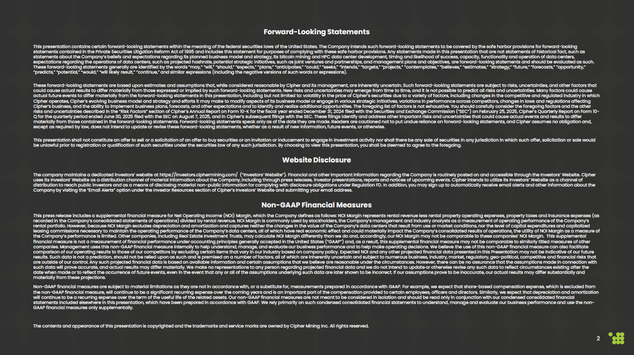 2 Forward - Looking Statements This presentation contains certain forward - looking statements within the meaning of the federal securities laws of the United States. The Company intends such forward - looking statements to be covered by the safe harbor provisions for forward - looking statements contained in the Private Securities Litigation Reform Act of 1995 and includes this statement for purposes of complying with these safe harbor provisions. Any statements made in this presentation that are not statements of historical fact, such as statements about the Company’s beliefs and expectations regarding its planned business model and strategy, its bitcoin mining and HPC data center development, timing and likelihood of success, capacity, functionality and operation of data centers, expectations regarding the operations of data centers, such as projected hashrate, potential strategic initiatives, such as joint ventures and partnerships, and management plans and objectives, are forward - looking statements and should be evaluated as such. These forward - looking statements generally are identified by the words “may,” “will,” “should,” “expects,” “plans,” “anticipates,” “could,” “seeks,” “intends,” “targets,” “projects,” “contemplates,” “believes,” “estimates,” “strategy,” “future,” “forecasts,” “opportunity,” “predicts,” “potential,” “would,” “will likely result,” “continue,” and similar expressions (including the negative versions of such words or expressions). These forward - looking statements are based upon estimates and assumptions that, while considered reasonable by Cipher and its management, are inherently uncertain. Such forward - looking statements are subject to risks, uncertainties, and other factors that could cause actual results to differ materially from those expressed or implied by such forward - looking statements. New risks and uncertainties may emerge from time to time, and it is not possible to predict all risks and uncertainties. Many factors could cause actual future events to differ materially from the forward - looking statements in this presentation, including but not limited to: volatility in the price of Cipher’s securities due to a variety of factors, including changes in the competitive and regulated industry in which Cipher operates, Cipher’s evolving business model and strategy and efforts it may make to modify aspects of its business model or engage in various strategic initiatives, variations in performance across competitors, changes in laws and regulations affecting Cipher’s business, and the ability to implement business plans, forecasts, and other expectations and to identify and realize additional opportunities. The foregoing list of factors is not exhaustive. You should carefully consider the foregoing factors and the other risks and uncertainties described in the “Risk Factors” section of Cipher’s Annual Report on Form 10 - K for the fiscal year ended December 31, 2024 filed with the Securities and Exchange Commission (“SEC”) on February 25, 2025, Cipher’s Quarterly Report on Form 10 - Q for the quarterly period ended June 30, 2025 filed with the SEC on August 7, 2025, and in Cipher’s subsequent filings with the SEC. These filings identify and address other important risks and uncertainties that could cause actual events and results to differ materially from those contained in the forward - looking statements. Forward - looking statements speak only as of the date they are made. Readers are cautioned not to put undue reliance on forward - looking statements, and Cipher assumes no obligation and, except as required by law, does not intend to update or revise these forward - looking statements, whether as a result of new information, future events, or otherwise. This presentation shall not constitute an offer to sell or a solicitation of an offer to buy securities or an invitation or inducement to engage in investment activity nor shall there be any sale of securities in any jurisdiction in which such offer, solicitation or sale would be unlawful prior to registration or qualification of such securities under the securities law of any such jurisdiction. By choosing to view this presentation, you shall be deemed to agree to the foregoing. Website Disclosure The company maintains a dedicated investors’ website at https://investors.ciphermining.com/ (“Investors’ Website”). Financial and other important information regarding the Company is routinely posted on and accessible through the Investors’ Website. Cipher uses its Investors’ Website as a distribution channel of material information about the Company, including through press releases, investor presentations, reports and notices of upcoming events. Cipher intends to utilize its Investors’ Website as a channel of distribution to reach public investors and as a means of disclosing material non - public information for complying with disclosure obligations under Regulation FD. In addition, you may sign up to automatically receive email alerts and other information about the Company by visiting the “Email Alerts” option under the Investor Resources section of Cipher’s Investors’ Website and submitting your email address. Non - GAAP Financial Measures This press release includes a supplemental financial measure for Net Operating Income (NOI) Margin, which the Company defines as follows: NOI Margin represents rental revenue less rental property operating expenses, property taxes and insurance expenses (as recorded in the Company’s consolidated statements of operations) divided by rental revenue. NOI Margin is commonly used by stockholders, the Company’s management and industry analysts as a measurement of operating performance of the Company’s rental portfolio. However, because NOI Margin excludes depreciation and amortization and captures neither the changes in the
