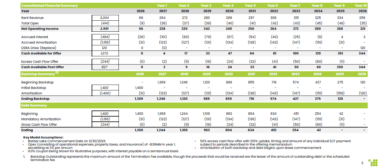 Year 10 Year 9 Year 8 Year 7 Year 6 Year 5 Year 4 Year 3 Year 2 Year 1 Consolidated Financial Summary 20 36 20 35 20 34 2033 20 32 20 31 20 30 2029 2028 2027 2026 Year 256 (35) 334 (46) 325 (45) 315 (43) 306 (42) 297 (41) 289 (40) 280 (39) 272 (37) 264 (36) 66 (9) 3,004 Rent Revenue Total Opex (414) 221 288 280 272 264 256 249 242 235 228 56 2,591 Net Operating Income 3 - 12 0 4 (31) - (8) (151) - ( 25) ( 147) - ( 40) ( 143) - ( 54) ( 13 8 ) - ( 67) ( 134) - ( 79) ( 131) - ( 90) ( 127) - (101) (123) (0) ( 26) ( 31) 0 (484) Accrued Interest Accrued Amortization DSRA Draw (Replace) (1,156) 120 344 261 120 100 81 64 47 32 17 4 0 1,072 Cash Available for Offer 1,400 (1,400) - 120 275 427 574 716 855 989 1,120 1,246 1,369 Ending Backstop - - - 42 (31) (11) 254 (151) (60) 451 (147) (50) 634 (143) (41) 804 (138) (32) 962 (134) (24) 1,109 (131) (16) 1,244 ( 127) ( 9) 1,369 ( 123) ( 2) 1,400 ( 31) ( 0) 1,400 Beginning Mandatory Amortization Gross Cash Flow Offer (1,156) (244) - - 42 254 451 634 804 962 1,109 1,244 1,369 Ending - ( 11) ( 60) ( 50) ( 41) ( 32) ( 24) ( 16) ( 9) ( 2) ( 0) (244) Excess Cash Flow Offer 344 2 50 60 50 41 32 24 16 9 2 0 827 Cash Available Post Offer 20 36 20 35 20 34 20 33 20 32 20 31 20 30 2029 2028 2027 2026 Backstop Summary (1) 120 275 427 574 716 8 55 9 89 1,120 1,246 1,369 - Beginning Backstop - - - - - - - - - - 1,400 Initial Backstop ( 120) ( 156) ( 151) ( 147) ( 143) ( 13 8 ) ( 134) ( 131) ( 127) ( 123) ( 31) Amortization Debt Summary Backstop and Debt Amortization Schedule for Cipher Compute All amounts are estimates and actual amounts may vary depending on final financing terms, construction timeline, and other factors Key Model Assumptions: • Barber Lake Commencement Date on 9/30/2026 • Opex (consisting of operational expenses, property taxes, and insurance) of ~$36MM in year 1, escalating at 3% per annum • 8.0% coupon being shown for illustrative purposes, with interest payable on a semiannual basis • 50% excess cash flow offer with 100% uptake, timing and amount of any individual ECF payment subject to periods described in the offering memorandum • Amortization of both backstop and debt begins upon lease commencement 1. Backstop Outstanding represents the maximum amount of the Termination Fee available, though the proceeds that would be received are the lesser of the amount of outstanding debt or the scheduled termination fee 3