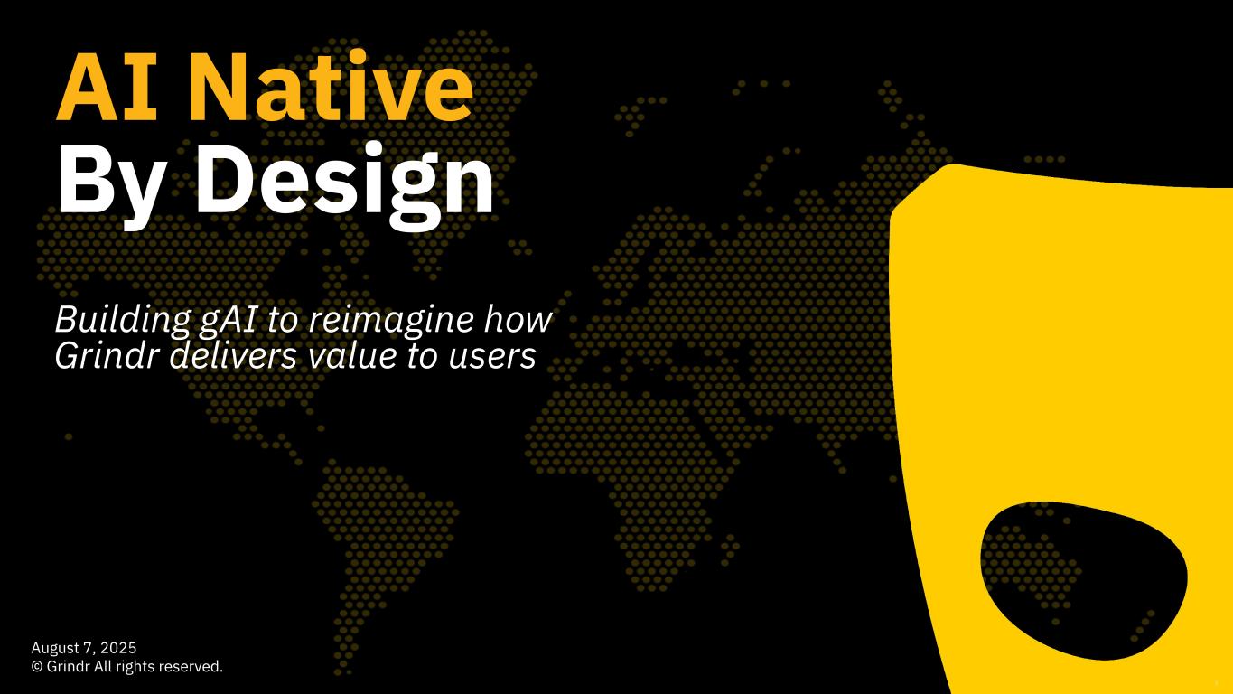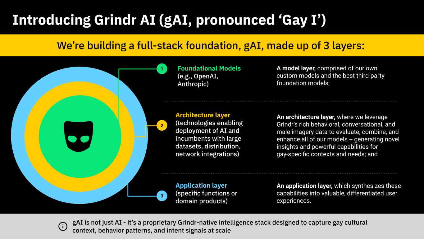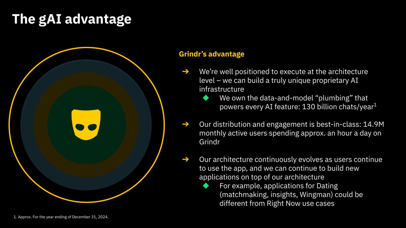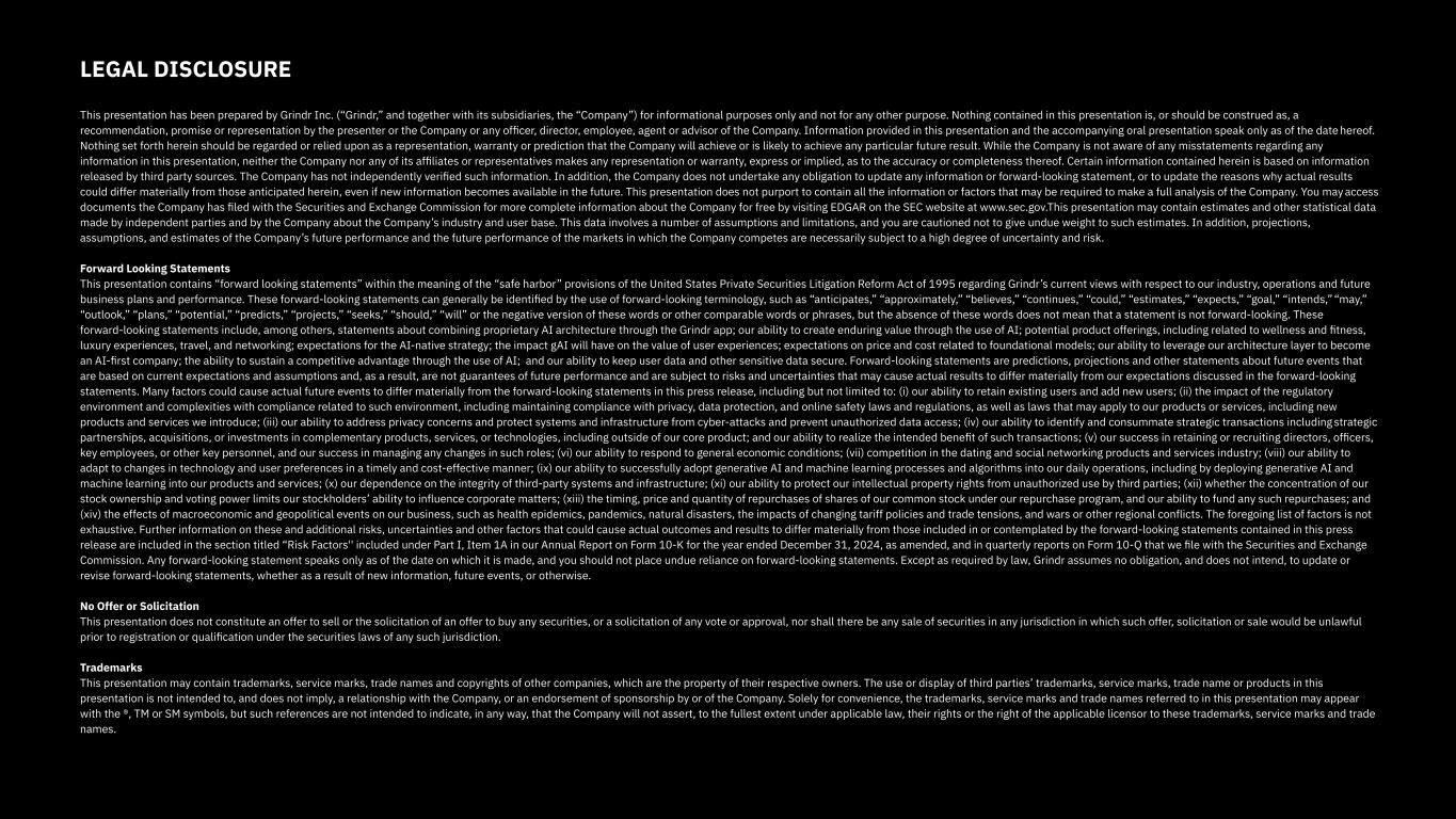 This presentation contains “forward looking statements” within the meaning of the “safe harbor” provisions of the United States Private Securities Litigation Reform Act of 1995 regarding Grindr’s current views with respect to our industry, operations and future business plans and performance. These forward-looking statements can generally be identified by the use of forward-looking terminology, such as “anticipates,” “approximately,” “believes,” “continues,” “could,” “estimates,” “expects,” “goal,” “intends,” “may,” “outlook,” “plans,” “potential,” “predicts,” “projects,” “seeks,” “should,” “will” or the negative version of these words or other comparable words or phrases, but the absence of these words does not mean that a statement is not forward-looking. These forward-looking statements include, among others, statements about combining proprietary AI architecture through the Grindr app; our ability to create enduring value through the use of AI; potential product offerings, including related to wellness and fitness, luxury experiences, travel, and networking; expectations for the AI-native strategy; the impact gAI will have on the value of user experiences; expectations on price and cost related to foundational models; our ability to leverage our architecture layer to become an AI-first company; the ability to sustain a competitive advantage through the use of AI; and our ability to keep user data and other sensitive data secure. Forward-looking statements are predictions, projections and other statements about future events that are based on current expectations and assumptions and, as a result, are not guarantees of future performance and are subject to risks and uncertainties that may cause actual results to differ materially from our expectations discussed in the forward-looking statements. Many factors could cause actual future events to differ materially from the forward-looking statements in this press release, including but not limited to: (i) our ability to retain existing users and add new users; (ii) the impact of the regulatory environment and complexities with compliance related to such environment, including maintaining compliance with privacy, data protection, and online safety laws and regulations, as well as laws that may apply to our products or services, including new products and services we introduce; (iii) our ability to address privacy concerns and protect systems and infrastructure from cyber-attacks and prevent unauthorized data access; (iv) our ability to identify and consummate strategic transactions including strategic partnerships, acquisitions, or investments in complementary products, services, or technologies, including outside of our core product; and our ability to realize the intended benefit of such transactions; (v) our success in retaining or recruiting directors, officers, key employees, or other key personnel, and our success in managing any changes in such roles; (vi) our ability to respond to general economic conditions; (vii) competition in the dating and social networking products and services industry; (viii) our ability to adapt to changes in technology and user preferences in a timely and cost-effective manner; (ix) our ability to successfully adopt generative AI and machine learning processes and algorithms into our daily operations, including by deploying generative AI and machine learning into our products and services; (x) our dependence on the integrity of third-party systems and infrastructure; (xi) our ability to protect our intellectual property rights from unauthorized use by third parties; (xii) whether the concentration of our stock ownership and voting power limits our stockholders’ ability to influence corporate matters; (xiii) the timing, price and quantity of repurchases of shares of our common stock under our repurchase program, and our ability to fund any such repurchases; and (xiv) the effects of macroeconomic and geopolitical events on our business, such as health epidemics, pandemics, natural disasters, the impacts of changing tariff policies and trade tensions, and wars or other regional conflicts. The foregoing list of factors is not exhaustive. Further information on these and additional risks, uncertainties and other factors that could cause actual outcomes and results to differ materially from those included in or contemplated by the forward-looking statements contained in this press release are included in the section titled “Risk Factors'' included under Part I, Item 1A in our Annual Report on Form 10-K for the year ended December 31, 2024, as amended, and in quarterly reports on Form 10-Q that we file with the Securities and Exchange Commission. Any forward-looking statement speaks only as of the date on which it is made, and you should not place undue reliance on forward-looking statements. Except as required by law, Grindr assumes no obligation, and does not intend, to update or revise forward-looking statements, whether as a result of new information, future events, or otherwise.