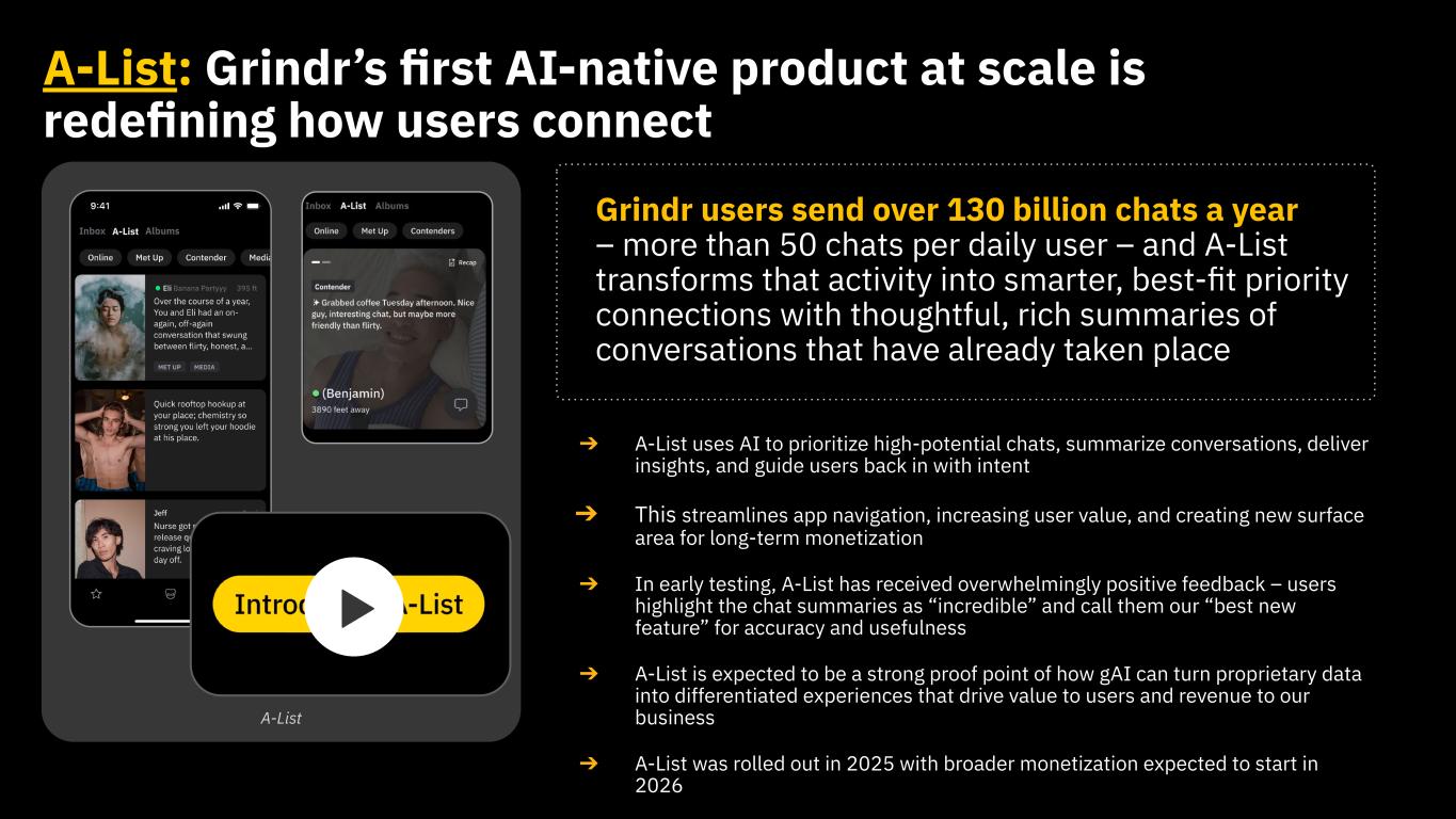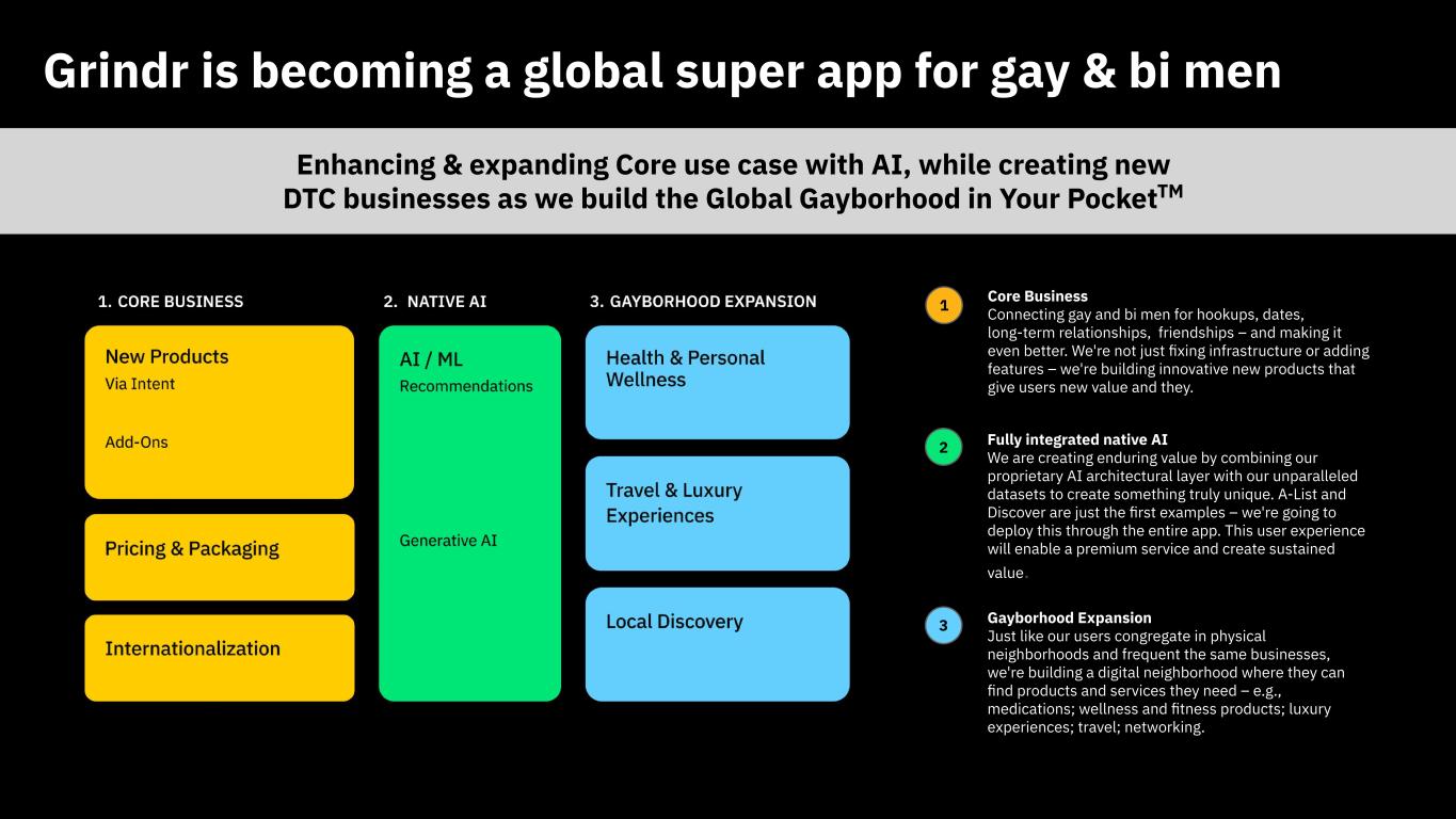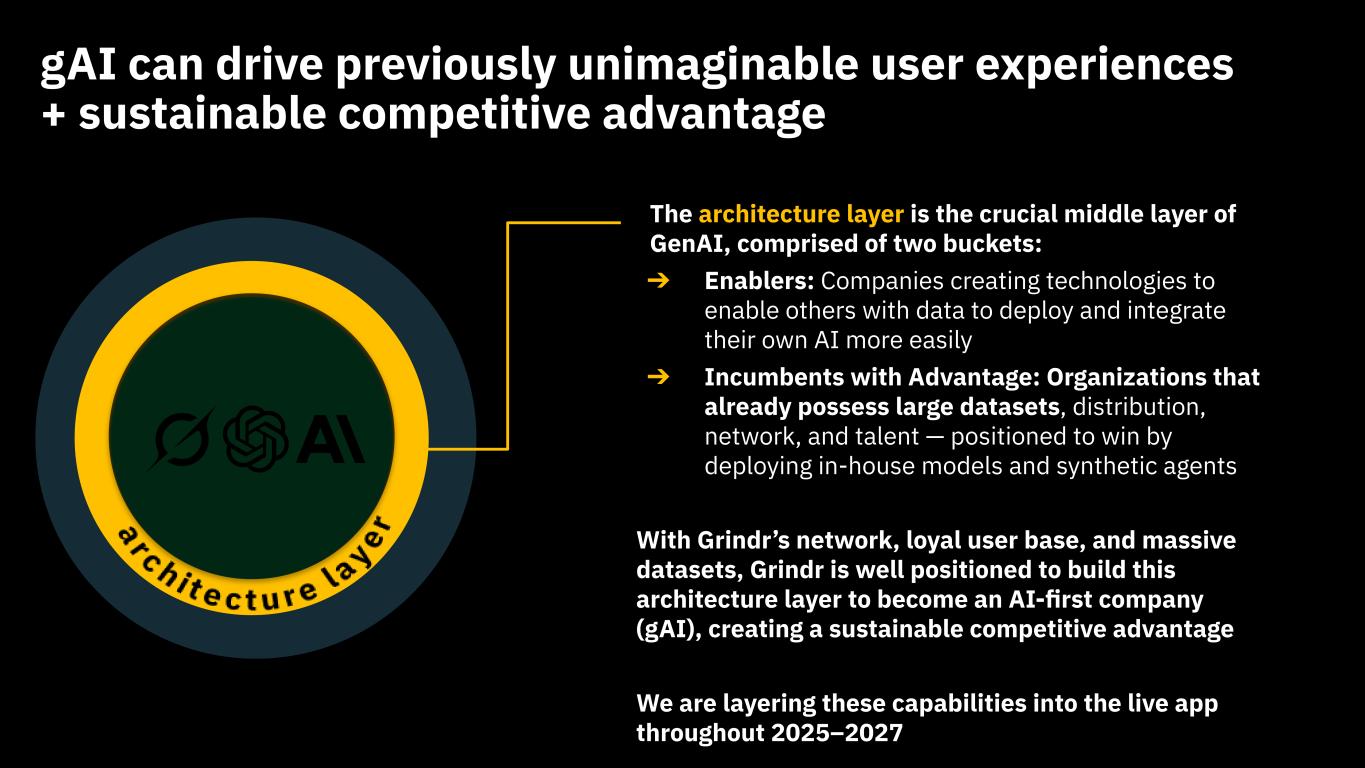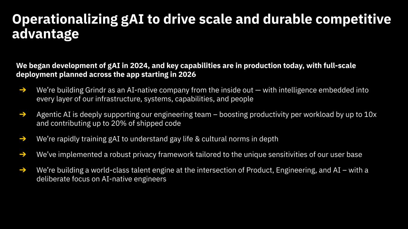 This presentation contains “forward looking statements” within the meaning of the “safe harbor” provisions of the United States Private Securities Litigation Reform Act of 1995 regarding Grindr’s current views with respect to our industry, operations and future business plans and performance. These forward-looking statements can generally be identified by the use of forward-looking terminology, such as “anticipates,” “approximately,” “believes,” “continues,” “could,” “estimates,” “expects,” “goal,” “intends,” “may,” “outlook,” “plans,” “potential,” “predicts,” “projects,” “seeks,” “should,” “will” or the negative version of these words or other comparable words or phrases, but the absence of these words does not mean that a statement is not forward-looking. These forward-looking statements include, among others, statements about combining proprietary AI architecture through the Grindr app; our ability to create enduring value through the use of AI; potential product offerings, including related to wellness and fitness, luxury experiences, travel, and networking; expectations for the AI-native strategy; the impact gAI will have on the value of user experiences; expectations on price and cost related to foundational models; our ability to leverage our architecture layer to become an AI-first company; the ability to sustain a competitive advantage through the use of AI; and our ability to keep user data and other sensitive data secure. Forward-looking statements are predictions, projections and other statements about future events that are based on current expectations and assumptions and, as a result, are not guarantees of future performance and are subject to risks and uncertainties that may cause actual results to differ materially from our expectations discussed in the forward-looking statements. Many factors could cause actual future events to differ materially from the forward-looking statements in this press release, including but not limited to: (i) our ability to retain existing users and add new users; (ii) the impact of the regulatory environment and complexities with compliance related to such environment, including maintaining compliance with privacy, data protection, and online safety laws and regulations, as well as laws that may apply to our products or services, including new products and services we introduce; (iii) our ability to address privacy concerns and protect systems and infrastructure from cyber-attacks and prevent unauthorized data access; (iv) our ability to identify and consummate strategic transactions including strategic partnerships, acquisitions, or investments in complementary products, services, or technologies, including outside of our core product; and our ability to realize the intended benefit of such transactions; (v) our success in retaining or recruiting directors, officers, key employees, or other key personnel, and our success in managing any changes in such roles; (vi) our ability to respond to general economic conditions; (vii) competition in the dating and social networking products and services industry; (viii) our ability to adapt to changes in technology and user preferences in a timely and cost-effective manner; (ix) our ability to successfully adopt generative AI and machine learning processes and algorithms into our daily operations, including by deploying generative AI and machine learning into our products and services; (x) our dependence on the integrity of third-party systems and infrastructure; (xi) our ability to protect our intellectual property rights from unauthorized use by third parties; (xii) whether the concentration of our stock ownership and voting power limits our stockholders’ ability to influence corporate matters; (xiii) the timing, price and quantity of repurchases of shares of our common stock under our repurchase program, and our ability to fund any such repurchases; and (xiv) the effects of macroeconomic and geopolitical events on our business, such as health epidemics, pandemics, natural disasters, the impacts of changing tariff policies and trade tensions, and wars or other regional conflicts. The foregoing list of factors is not exhaustive. Further information on these and additional risks, uncertainties and other factors that could cause actual outcomes and results to differ materially from those included in or contemplated by the forward-looking statements contained in this press release are included in the section titled “Risk Factors'' included under Part I, Item 1A in our Annual Report on Form 10-K for the year ended December 31, 2024, as amended, and in quarterly reports on Form 10-Q that we file with the Securities and Exchange Commission. Any forward-looking statement speaks only as of the date on which it is made, and you should not place undue reliance on forward-looking statements. Except as required by law, Grindr assumes no obligation, and does not intend, to update or revise forward-looking statements, whether as a result of new information, future events, or otherwise.