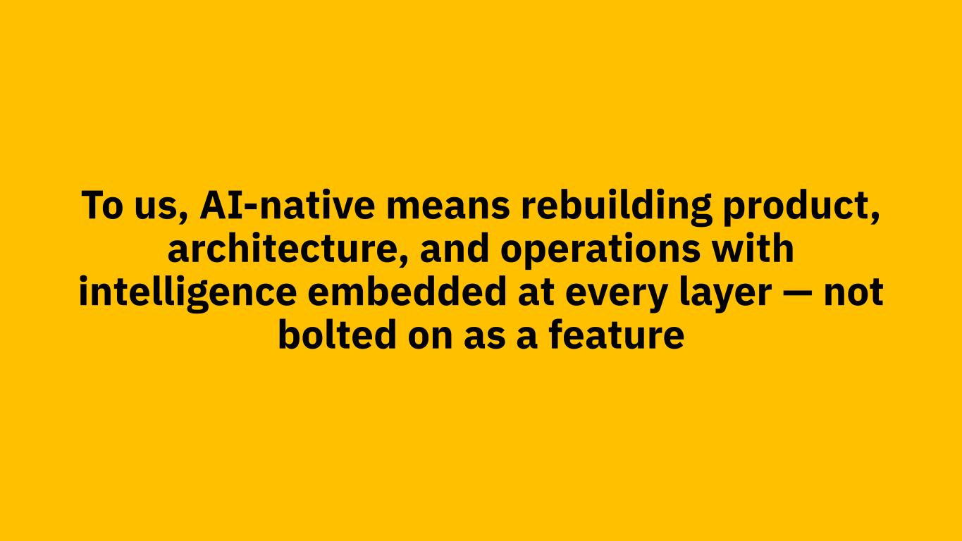 To us, AI-native means rebuilding product, architecture, and operations with intelligence embedded at every layer — not bolted on as a feature