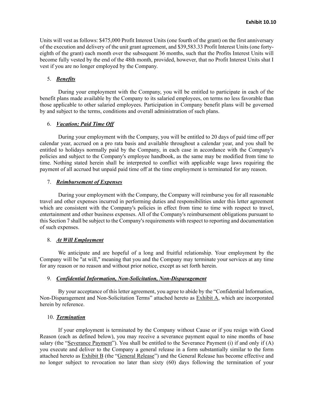 Exhibit 10.10  Units will vest as follows: $475,000 Profit Interest Units (one fourth of the grant) on the first anniversary  of the execution and delivery of the unit grant agreement, and $39,583.33 Profit Interest Units (one forty- eighth of the grant) each month over the subsequent 36 months, such that the Profits Interest Units will  become fully vested by the end of the 48th month, provided, however, that no Profit Interest Units shat I  vest if you are no longer employed by the Company.    5. Benefits    During your employment with the Company, you will be entitled to participate in each of the  benefit plans made available by the Company to its salaried employees, on terms no less favorable than  those applicable to other salaried employees. Participation in Company benefit plans will be governed  by and subject to the terms, conditions and overall administration of such plans.    6. Vacation; Paid Time Off    During your employment with the Company, you will be entitled to 20 days of paid time off per  calendar year, accrued on a pro rata basis and available throughout a calendar year, and you shall be  entitled to holidays normally paid by the Company, in each case in accordance with the Company's  policies and subject to the Company's employee handbook, as the same may be modified from time to  time. Nothing stated herein shall be interpreted to conflict with applicable wage laws requiring the  payment of all accrued but unpaid paid time off at the time employment is terminated for any reason.    7. Reimbursement of Expenses    During your employment with the Company, the Company will reimburse you for all reasonable  travel and other expenses incurred in performing duties and responsibilities under this letter agreement  which are consistent with the Company's policies in effect from time to time with respect to travel,  entertainment and other business expenses. All of the Company's reimbursement obligations pursuant to  this Section 7 shall be subject to the Company's requirements with respect to reporting and documentation  of such expenses.    8. At Will Employment    We anticipate and are hopeful of a long and fruitful relationship. Your employment by the  Company will be "at will," meaning that you and the Company may terminate your services at any time  for any reason or no reason and without prior notice, except as set forth herein.    9. Confidential Information, Non-Solicitation, Non-Disparagement    By your acceptance of this letter agreement, you agree to abide by the “Confidential Information,  Non-Disparagement and Non-Solicitation Terms” attached hereto as Exhibit A, which are incorporated  herein by reference.    10. Termination    If your employment is terminated by the Company without Cause or if you resign with Good  Reason (each as defined below), you may receive a severance payment equal to nine months of base  salary (the “Severance Payment”). You shall be entitled to the Severance Payment (i) if and only if (A)  you execute and deliver to the Company a general release in a form substantially similar to the form  attached hereto as Exhibit B (the “General Release”) and the General Release has become effective and  no longer subject to revocation no later than sixty (60) days following the termination of your