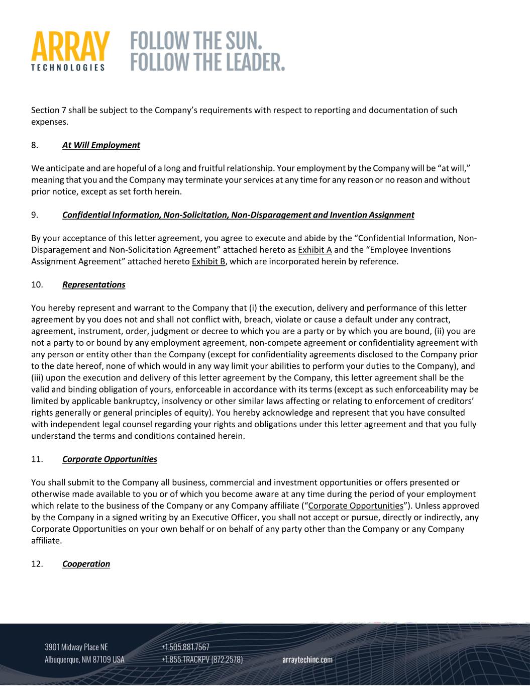 Section 7 shall be subject to the Company’s requirements with respect to reporting and documentation of such  expenses.    8. At Will Employment  We anticipate and are hopeful of a long and fruitful relationship. Your employment by the Company will be “at will,”  meaning that you and the Company may terminate your services at any time for any reason or no reason and without  prior notice, except as set forth herein.    9. Confidential Information, Non‐Solicitation, Non‐Disparagement and Invention Assignment    By your acceptance of this letter agreement, you agree to execute and abide by the “Confidential Information, Non‐  Disparagement and Non‐Solicitation Agreement” attached hereto as Exhibit A and the “Employee Inventions  Assignment Agreement” attached hereto Exhibit B, which are incorporated herein by reference.  10. Representations    You hereby represent and warrant to the Company that (i) the execution, delivery and performance of this letter  agreement by you does not and shall not conflict with, breach, violate or cause a default under any contract,  agreement, instrument, order, judgment or decree to which you are a party or by which you are bound, (ii) you are  not a party to or bound by any employment agreement, non‐compete agreement or confidentiality agreement with  any person or entity other than the Company (except for confidentiality agreements disclosed to the Company prior  to the date hereof, none of which would in any way limit your abilities to perform your duties to the Company), and  (iii) upon the execution and delivery of this letter agreement by the Company, this letter agreement shall be the  valid and binding obligation of yours, enforceable in accordance with its terms (except as such enforceability may be  limited by applicable bankruptcy, insolvency or other similar laws affecting or relating to enforcement of creditors’  rights generally or general principles of equity). You hereby acknowledge and represent that you have consulted  with independent legal counsel regarding your rights and obligations under this letter agreement and that you fully  understand the terms and conditions contained herein.  11. Corporate Opportunities    You shall submit to the Company all business, commercial and investment opportunities or offers presented or  otherwise made available to you or of which you become aware at any time during the period of your employment  which relate to the business of the Company or any Company affiliate (“Corporate Opportunities”). Unless approved  by the Company in a signed writing by an Executive Officer, you shall not accept or pursue, directly or indirectly, any  Corporate Opportunities on your own behalf or on behalf of any party other than the Company or any Company  affiliate.  12. Cooperation