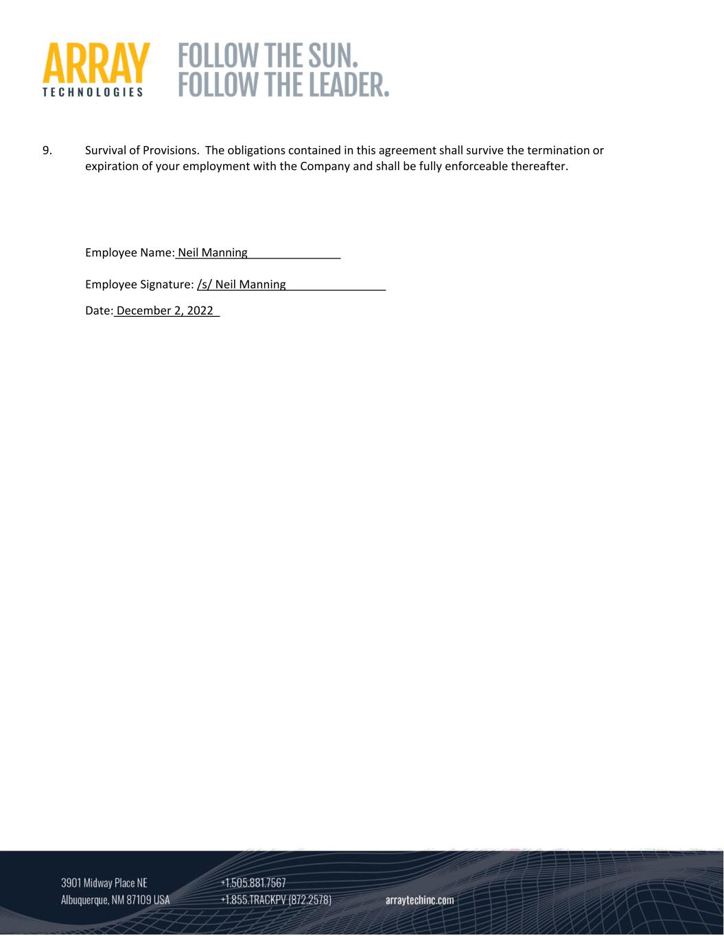 9. Survival of Provisions.  The obligations contained in this agreement shall survive the termination or  expiration of your employment with the Company and shall be fully enforceable thereafter.          Employee Name: Neil Manning      Employee Signature: /s/ Neil Manning    Date: December 2, 2022