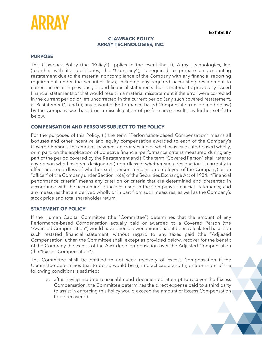 Exhibit 97        CLAWBACK POLICY  ARRAY TECHNOLOGIES, INC.   PURPOSE  This Clawback Policy (the “Policy”) applies in the event that (i) Array Technologies, Inc.  (together with its subsidiaries, the “Company”), is required to prepare an accounting  restatement due to the material noncompliance of the Company with any financial reporting  requirement under the securities laws, including any required accounting restatement to  correct an error in previously issued financial statements that is material to previously issued  financial statements or that would result in a material misstatement if the error were corrected  in the current period or left uncorrected in the current period (any such covered restatement,  a “Restatement”), and (ii) any payout of Performance-based Compensation (as defined below)  by the Company was based on a miscalculation of performance results, as further set forth  below.   COMPENSATION AND PERSONS SUBJECT TO THE POLICY  For the purposes of this Policy, (i) the term “Performance-based Compensation” means all  bonuses and other incentive and equity compensation awarded to each of the Company’s  Covered Persons, the amount, payment and/or vesting of which was calculated based wholly,  or in part, on the application of objective financial performance criteria measured during any  part of the period covered by the Restatement and (ii) the term “Covered Person” shall refer to  any person who has been designated (regardless of whether such designation is currently in  effect and regardless of whether such person remains an employee of the Company) as an  “officer” of the Company under Section 16(a) of the Securities Exchange Act of 1934.  “Financial  performance criteria” means any criterion or criteria that are determined and presented in  accordance with the accounting principles used in the Company’s financial statements, and  any measures that are derived wholly or in part from such measures, as well as the Company’s  stock price and total shareholder return.  STATEMENT OF POLICY  If the Human Capital Committee (the “Committee”) determines that the amount of any  Performance-based Compensation actually paid or awarded to a Covered Person (the  “Awarded Compensation”) would have been a lower amount had it been calculated based on  such restated financial statement, without regard to any taxes paid (the “Adjusted  Compensation”), then the Committee shall, except as provided below, recover for the benefit  of the Company the excess of the Awarded Compensation over the Adjusted Compensation  (the “Excess Compensation”).    The Committee shall be entitled to not seek recovery of Excess Compensation if the  Committee determines that to do so would be (i) impracticable and (ii) one or more of the  following conditions is satisfied:  a. after having made a reasonable and documented attempt to recover the Excess  Compensation, the Committee determines the direct expense paid to a third party  to assist in enforcing this Policy would exceed the amount of Excess Compensation  to be recovered;